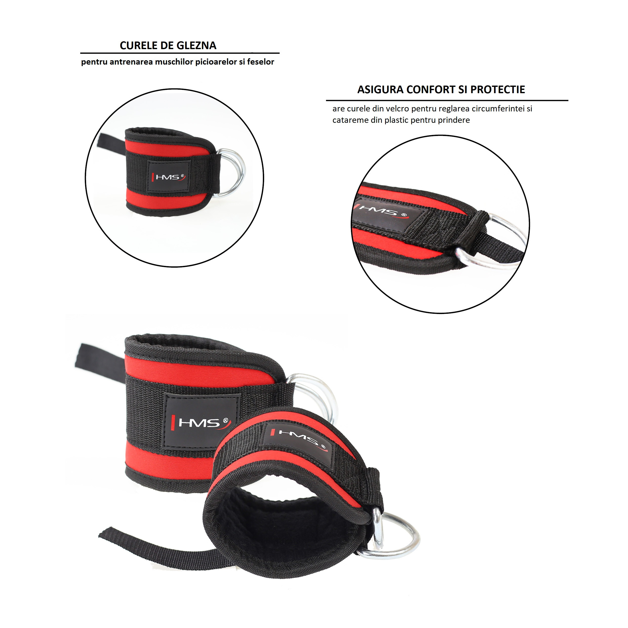 Set curele de antrenament pentru glezna HMS OPX01 ajuta la intarirea si cresterea fortei in picioare, coapse, fese si solduri. Captuseala din neopren asigura siguranta si confort in articulatia gleznei, materialul confortabil si durabil creste confortul antrenamentului. Un inel dublu puternic din otel va permite sa va antrenati pe orice tip de scripete.
