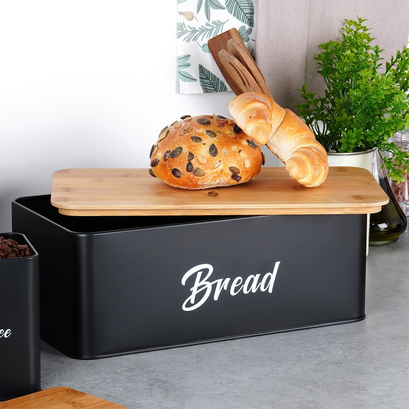 Set cutie pentru pâine și recipiente cafea, ceai, zahăr, metal negru cu bambus (4 piese)