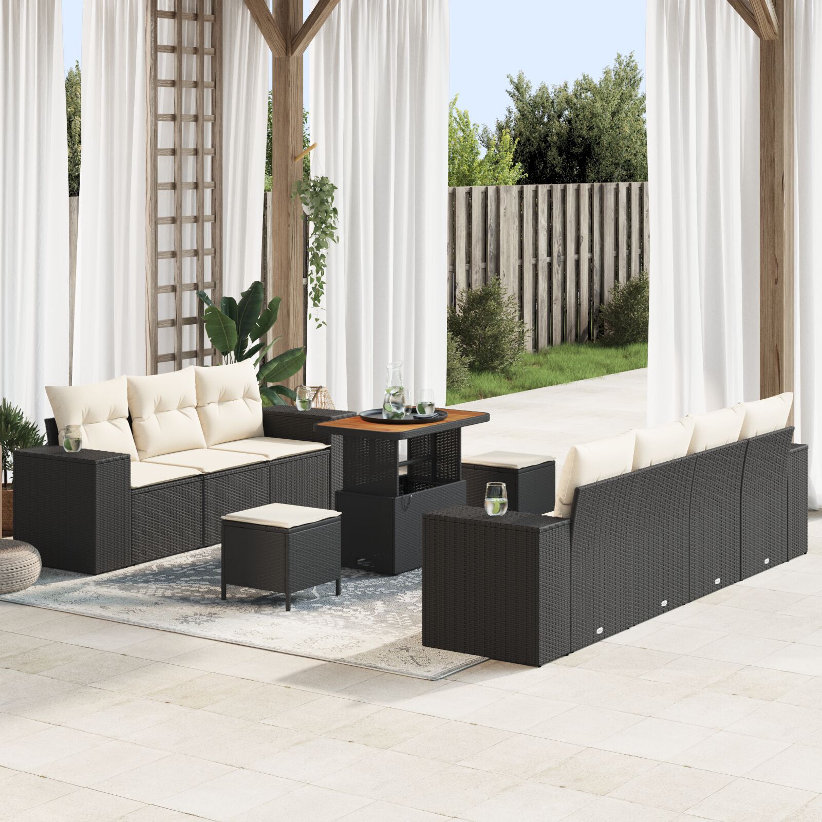 Set de 10 Piese de Canapea pentru Grădină cu Perne Negru Ratan Polimeric Acacia, Set de 3 Piese pentru Cină în Grădină cu Perne Negru Ratan Polimeric Acacia GartenMobel Dekor