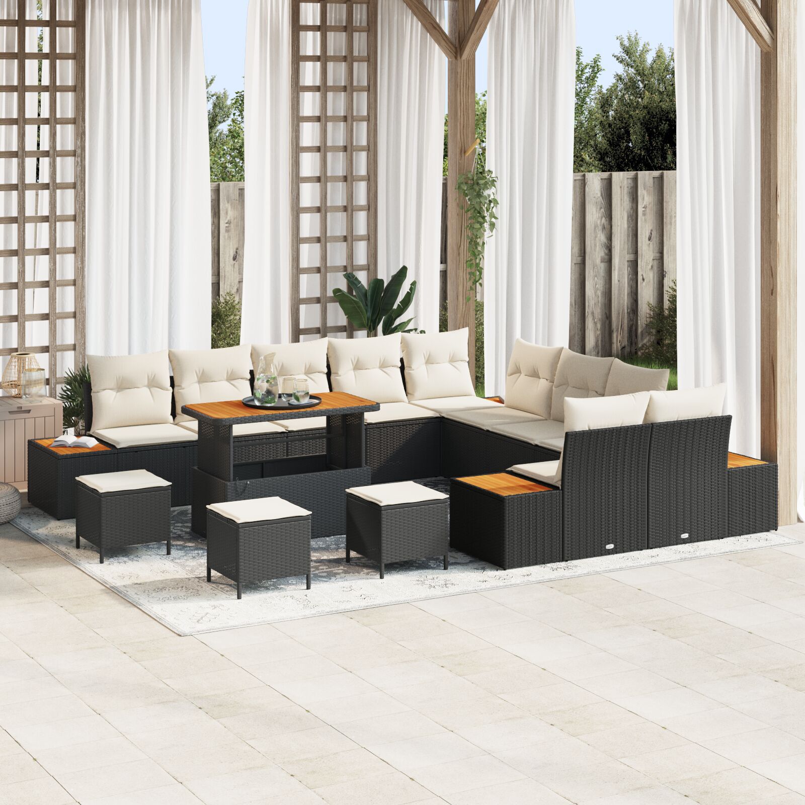Set de 14 piese sofa pentru grădină cu perne negre poliratan acacia, Set de dining pentru grădină cu 4 piese cu perne negre poliratan acacia GartenMobel Dekor