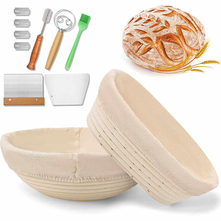 Set de 2 coșuri rotang pentru dospit pâine – coș rotund de 22,9 cm și coș oval de 25,4 cm cu căptușeală din in, racletă pentru aluat, lamă de tăiat și pensulă de silicon pentru copt Handy KitchenServ
