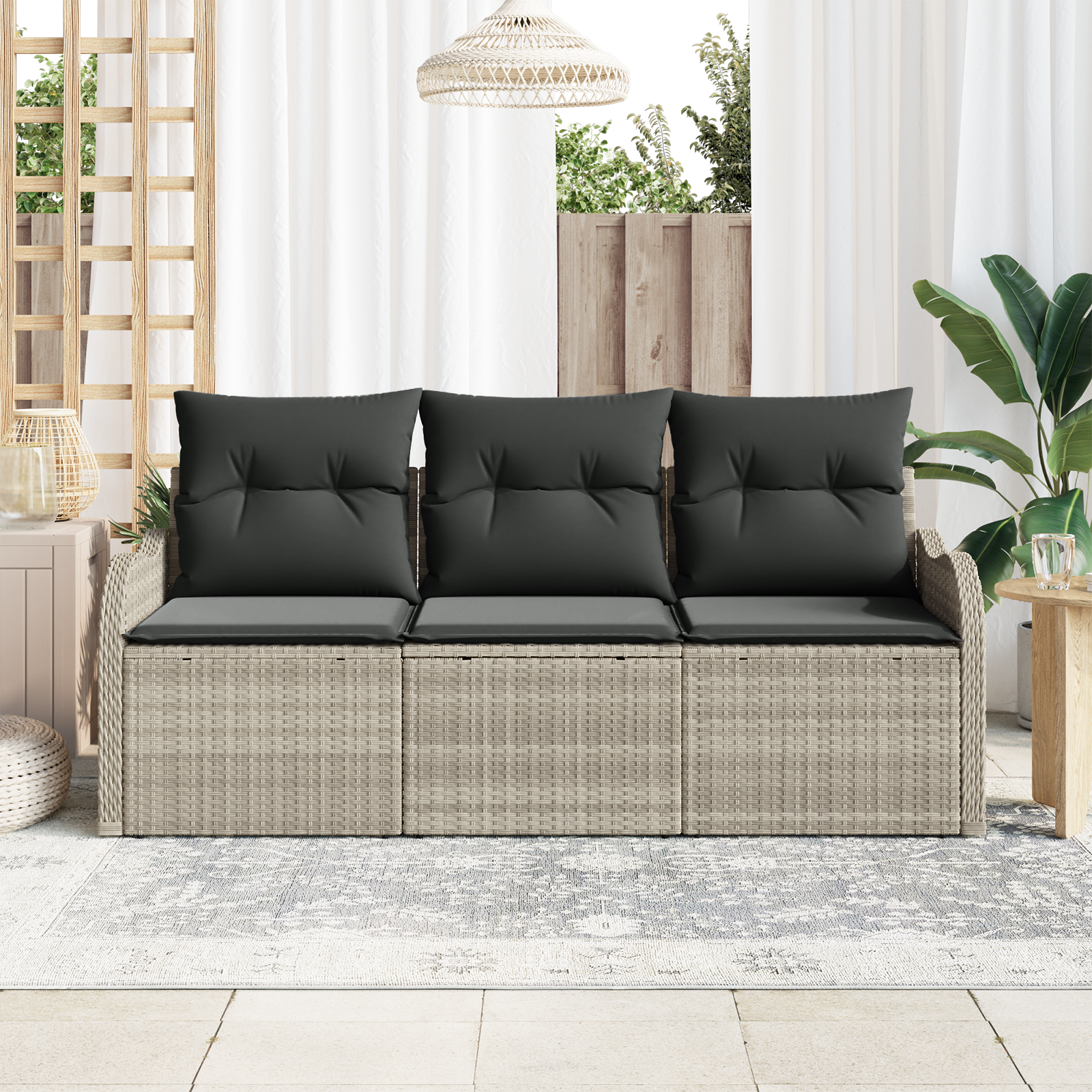 - Materiale Durabile: Fabricată din poliratan PE, această canapea oferă un aspect natural fără bătăi de cap. Cadrele ei rezistente din oțel suportă uzura zilnică afară.