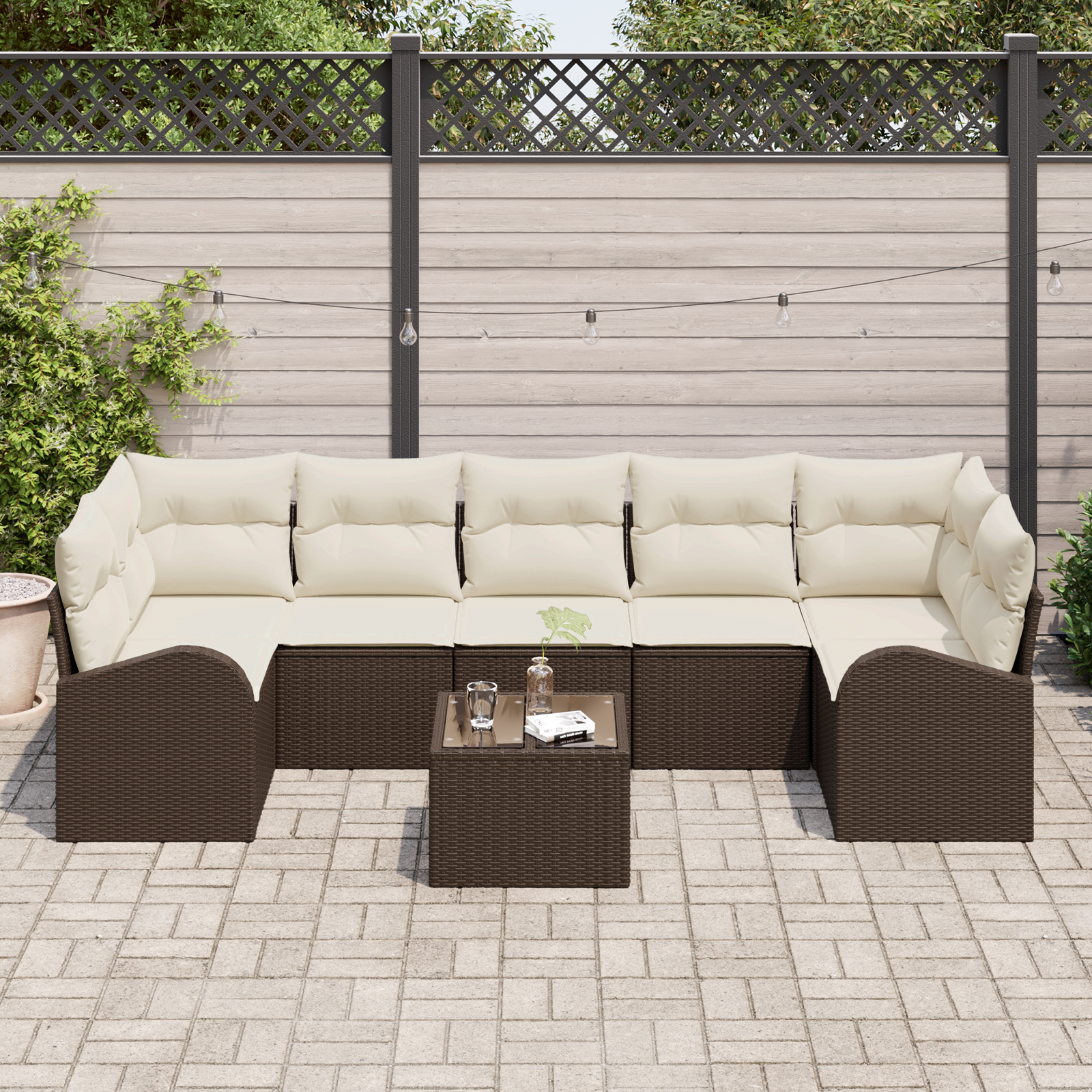 Setul ăsta de canapele pentru grădină, care vine cu 8 piese și perne, e tot despre stil și utilitate. E perfect pentru zonele de afară. Cu poliratanul său elegant maro și pernele moi crem, e construit pentru confort și relaxare, fie că stai pe terasă în după-amiaza însorită sau organizezi o mică petrecere în grădină.