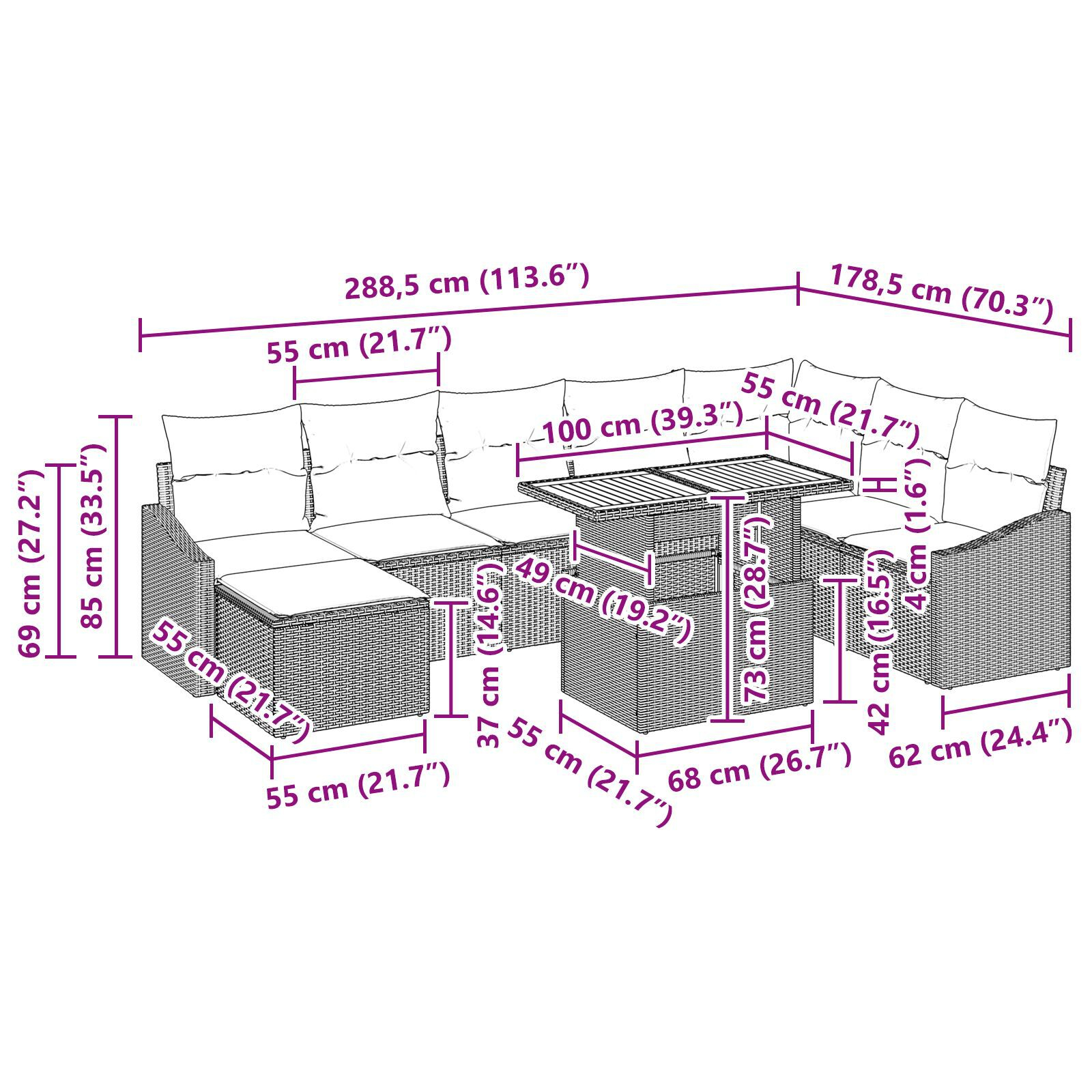 Setul de dining pentru grădină combină un design modern cu utilitate, fiind perfect pentru întâlniri. Are nouă piese ce includ o canapea modulară colțară, diverse opțiuni de șezut și o masă elegantă, totul gândit pentru a îmbunătăți atmosfera exterioară, oferind și soluții de depozitare.