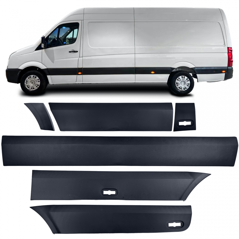 Set de trim / bandă de protecție pentru partea stângă (partea șoferului) set de 6 piese include:- Trim aripă stânga (arcada roții din față stânga) (număr de referință OE 2E1 853 535 CE, 2E0 853 121 / 2E0 853 121 C, 9066902562, 9066904782)- Trim ușă față stânga (număr de referință OE 2E0 853 517 C, 2E1 853 535 DA, 2E0 853 517 C / 2E0853517C, 9066904982)- Trim stâlp B stânga (număr de referință OE 2E1 853 535 CJ, 9066903062, 9066901182)- Trim panou lateral ușă glisantă stânga (număr de referință OE 2E1 853 535 BJ, 9066905382)- Trim panou lateral stânga (număr de referință: 2E1 853 535 CA, 9066903200)- Trim panou lateral din spate stânga (număr de referință: 2E1 853 535 CG, 9066901582)- Calitate OEM- Potrivire absolut precisă- Nou și ambalat originalVW Crafter Tip 2EAnul 2006 până în 2016Numai pentru vehicule cu ampatament lung L3 (LWB)Informații de siguranță a produsuluiProducător: Carparts-Online GmbHBrauckstr. 47, 58454 WittenContact: info@carparts-online.deInstrucțiuni de siguranță:Atenționare de siguranță a ambalajului:Există un risc de rănire din cauza marginilor ascuțite de hârtie, carton sau folie, precum și a clipsurilor metalice ascuțite.Materialul de ambalare nu este o jucărie. Risc de sufocare pentru copii sau animale.Atenționare de siguranță a produsului:Articolul ar trebui utilizat doar pentru funcția sa descrisă inițial. Dacă aveți întrebări, vă rugăm să ne contactați folosind detaliile de contact furnizate mai sus