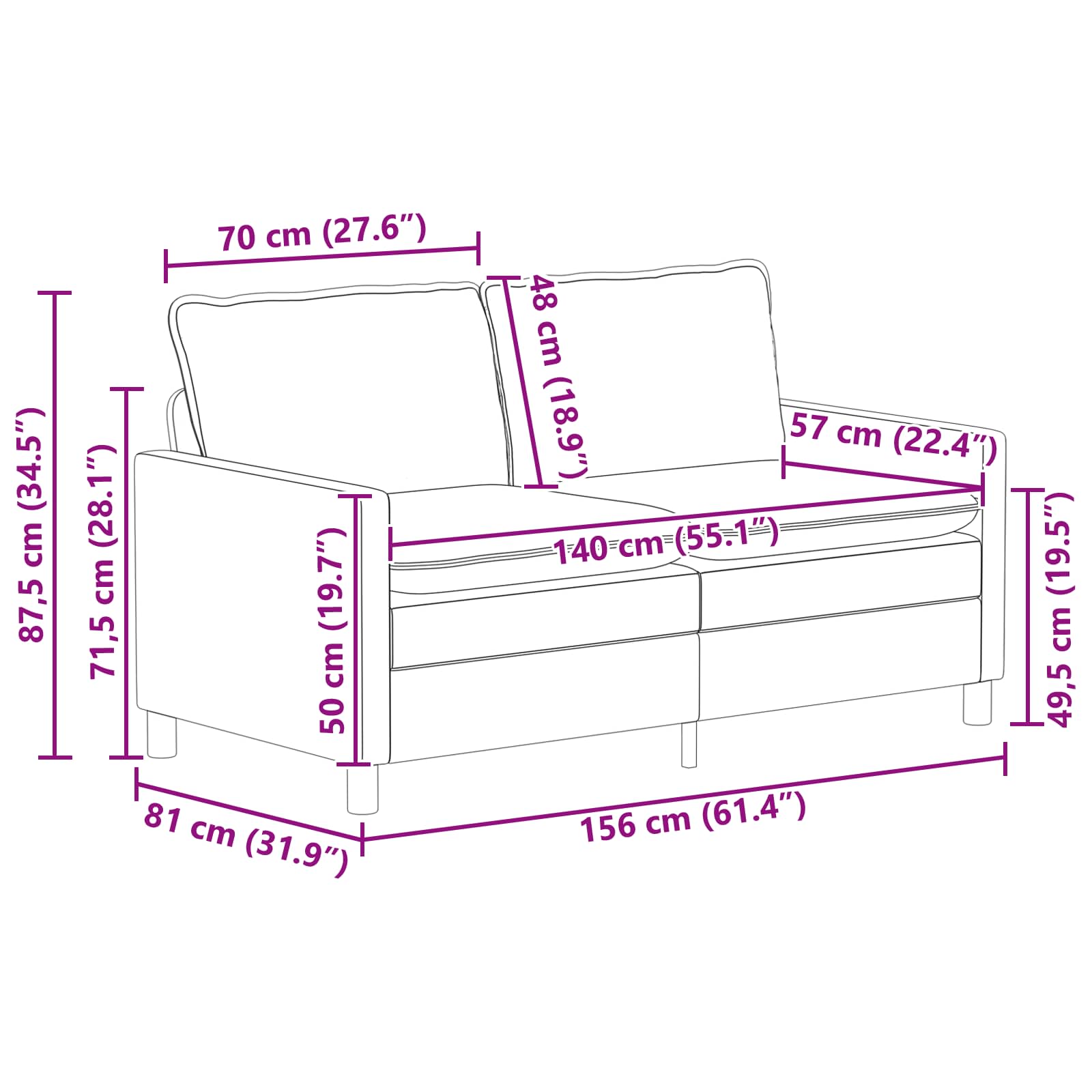 - 1 x canapea de 2 locuri: 156 x 81 x 87,5 cm (L x l x î)