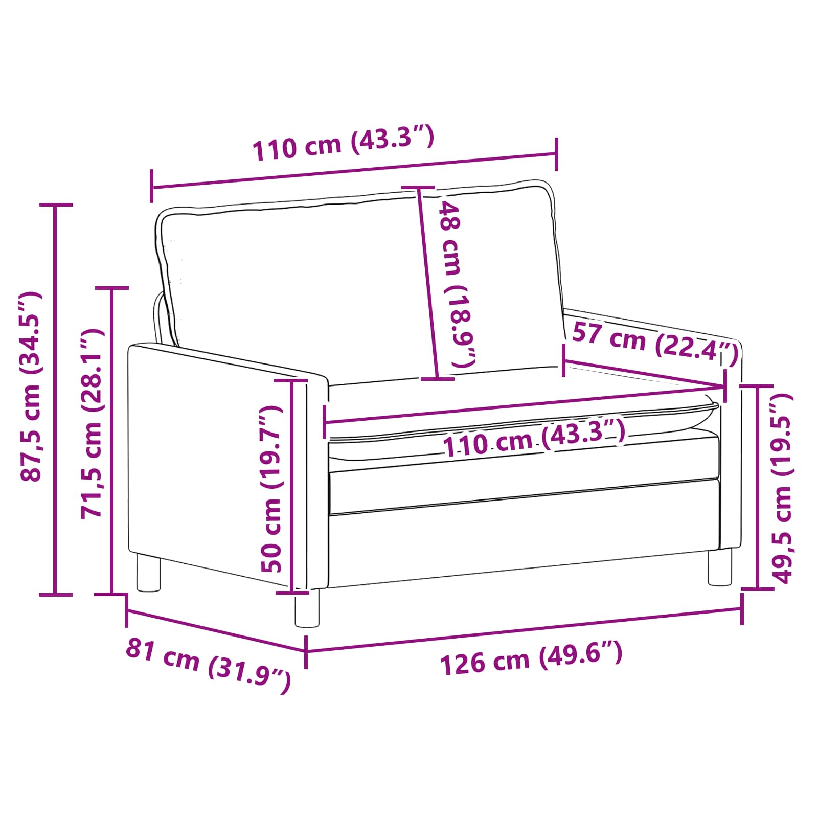 - 1 x Canapea pentru 2 persoane: 126 x 81 x 87,5 cm (L x l x î)