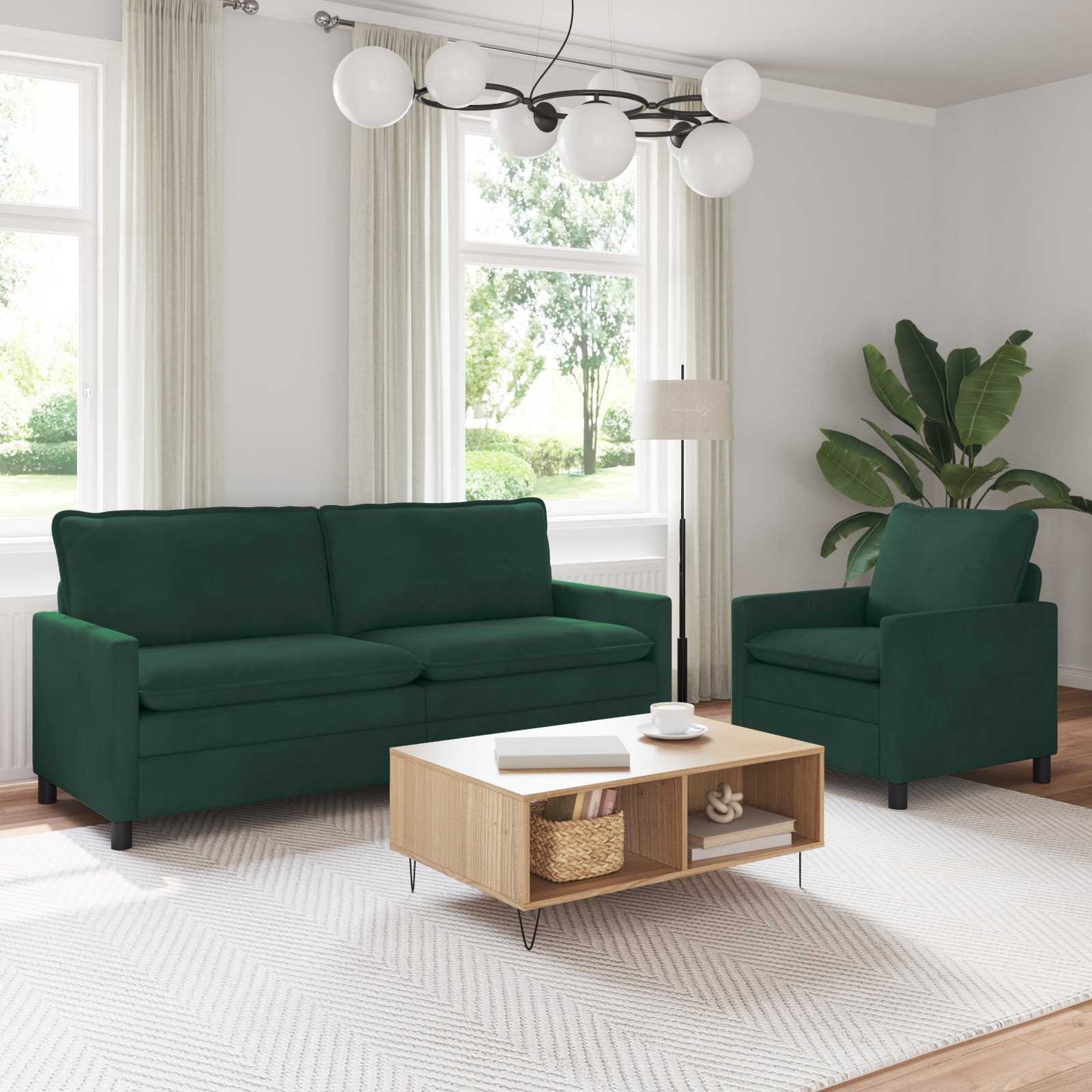 Setul ăsta de canapele moderne combină stilul contemporan cu confortul care funcționează bine în viața de zi cu zi. Catifeaua aduce un aer rafinat, iar designul simplu păstrează camera ordonată. Pernițele cu două straturi sunt perfecte pentru a te așeza comod fie când stai la vorbă, fie când citești. Se integrează ușor în apartamentele mici sau în spații mai mari.