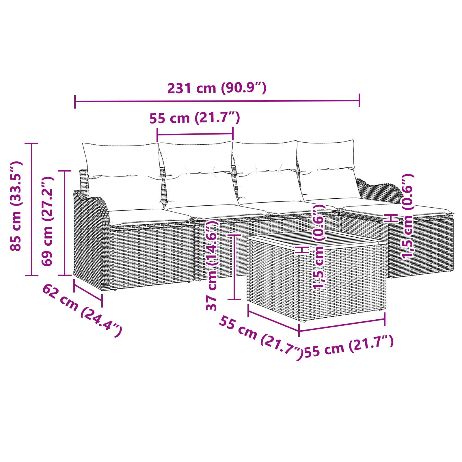 - Seat Depth: 55 cm
