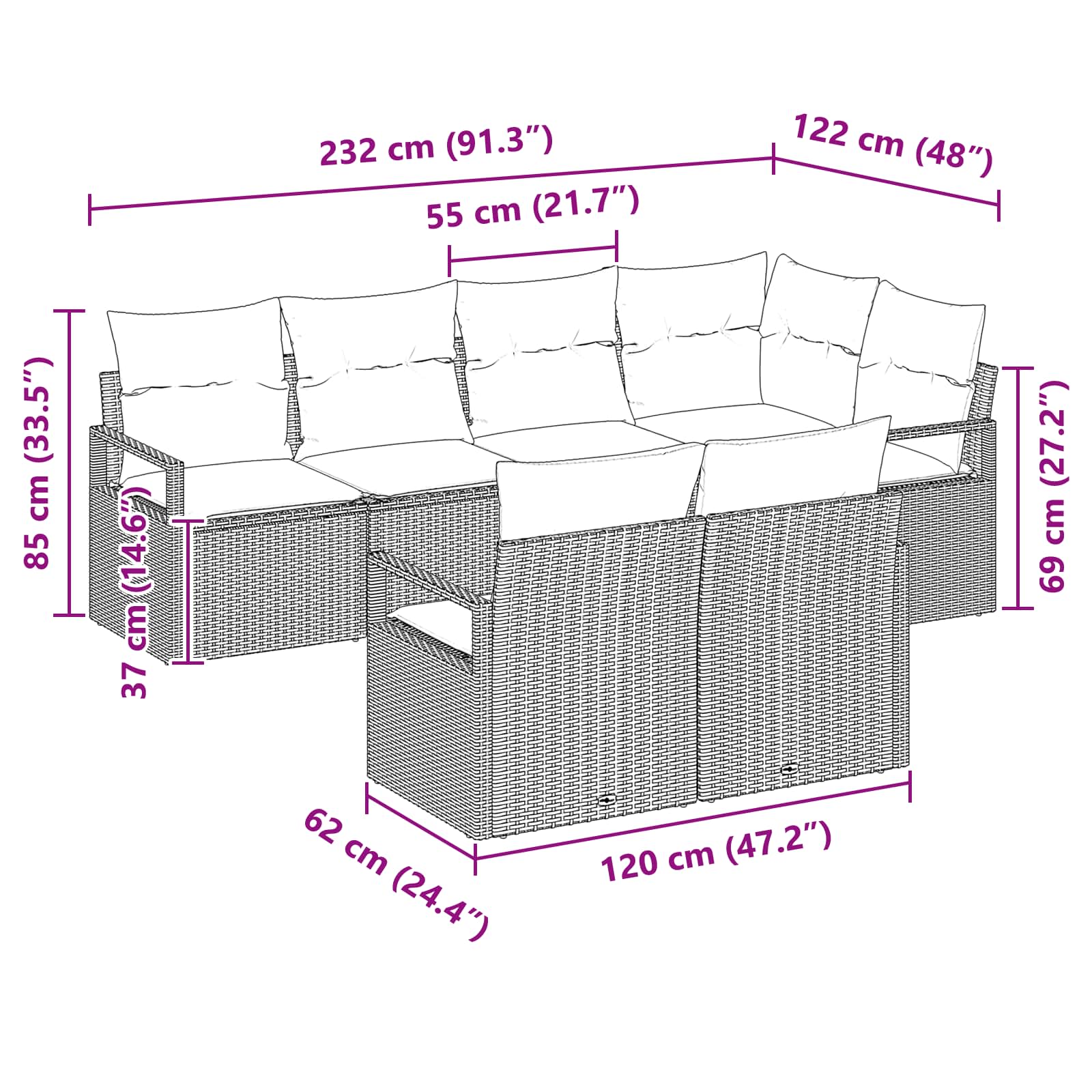 - 1 x loc de colț: 62x62x85 cm (LxWxH)