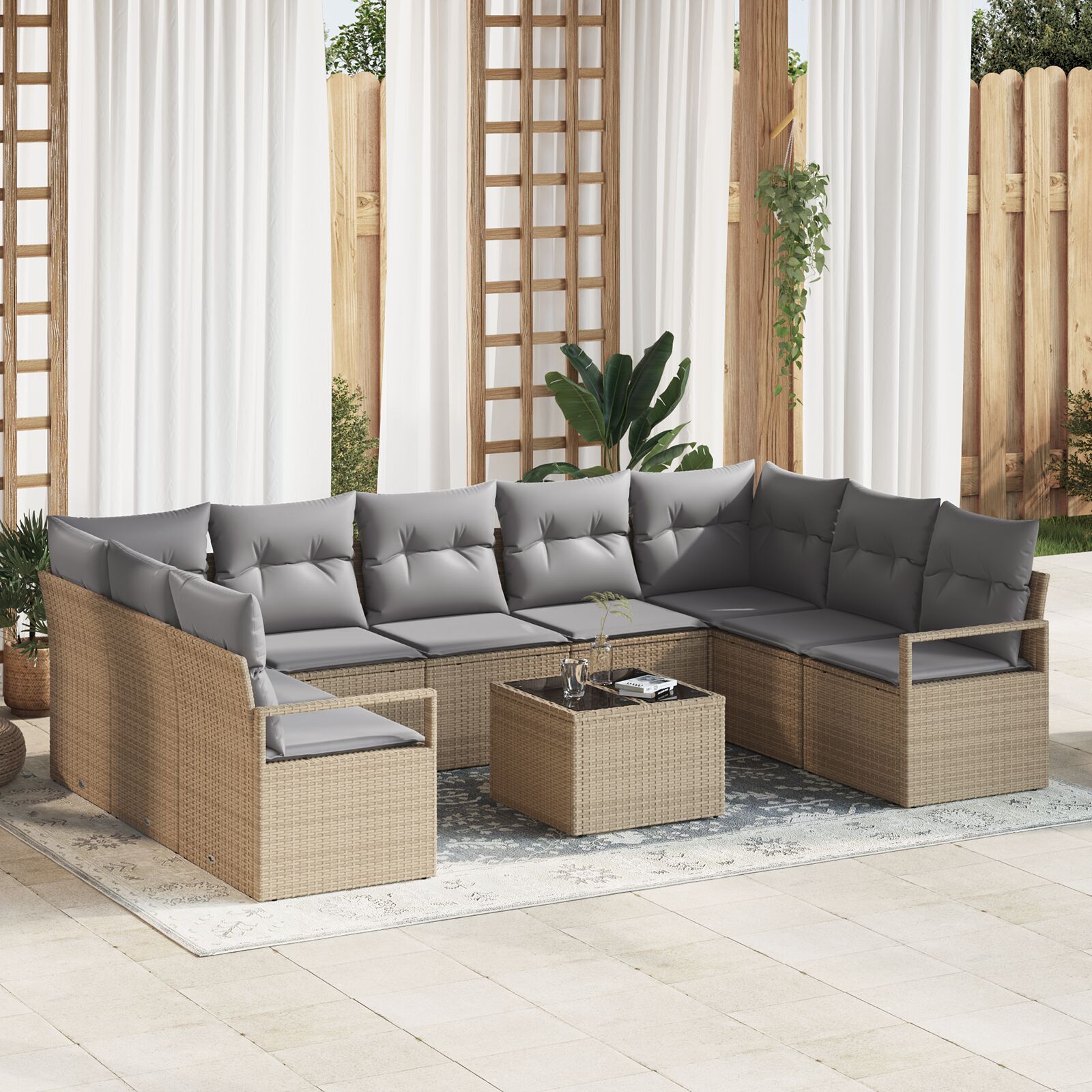 Set de Canapea cu 10 Piese cu Perne Bej Ratan, Canapea pentru Grădină cu 2 Locuri și Spațiu de Depozitare și Perne Bej Poliratan GartenMobel Dekor