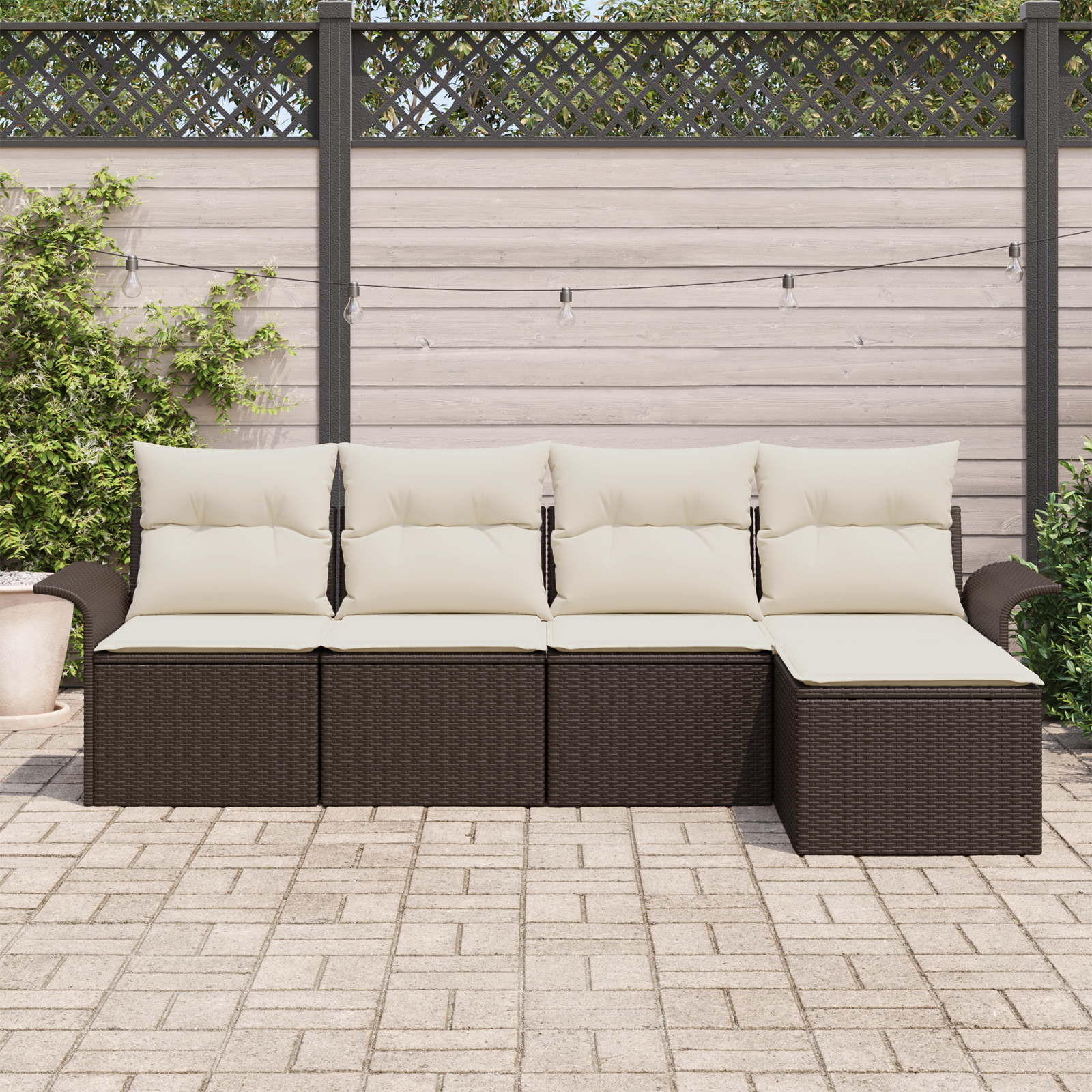 Acest set de canapele pentru exterior e exact ce trebuie pentru grădina sau balconul tău. Îmbină stilul și confortul, așa că e perfect atât pentru relaxare, cât și pentru distracție. E destul de mare și cu vibrații elegante de maro și crem, creând o atmosferă caldă, ideală pentru zilele însorite sau serile cozy cu prietenii și familia.