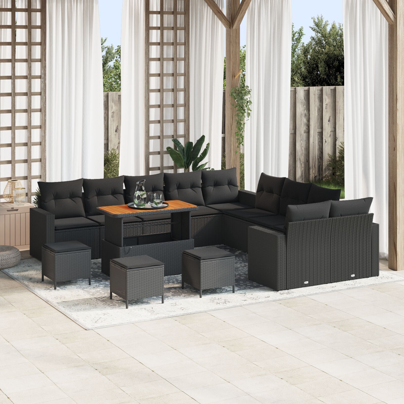 Set de canapea de grădină 14 piese cu perne negru poliratan acacia, Set de dining de grădină 4 piese cu perne negru poliratan acacia GartenMobel Dekor