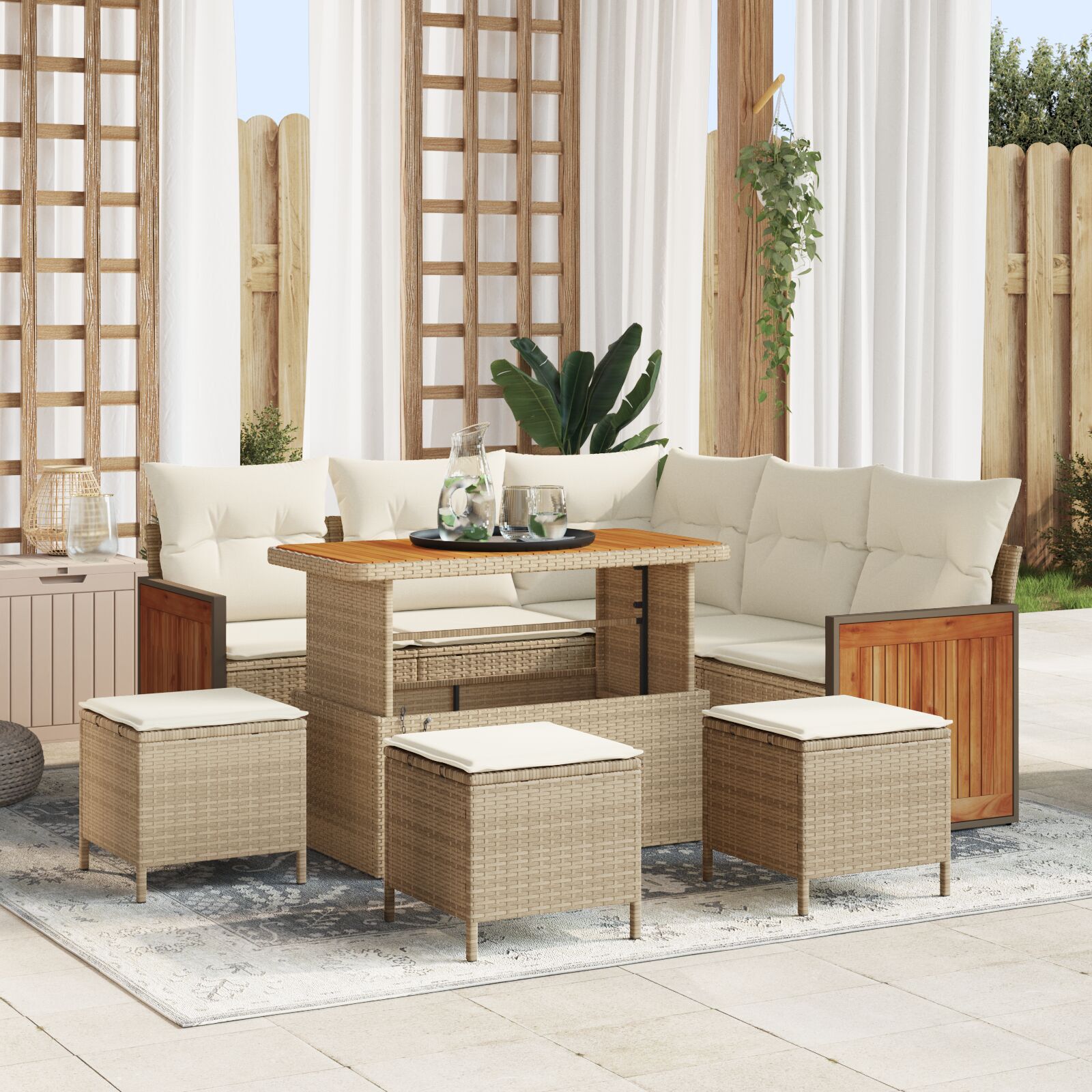 Set de canapea de grădină 9 piese cu perne Bej Ratan Poliratan Acacia, Canapea de grădină 2 locuri cu perne Bej Ratan Poliratan, Set de dining de grădină 4 piese cu perne Bej Ratan Poliratan Acacia GartenMobel Dekor