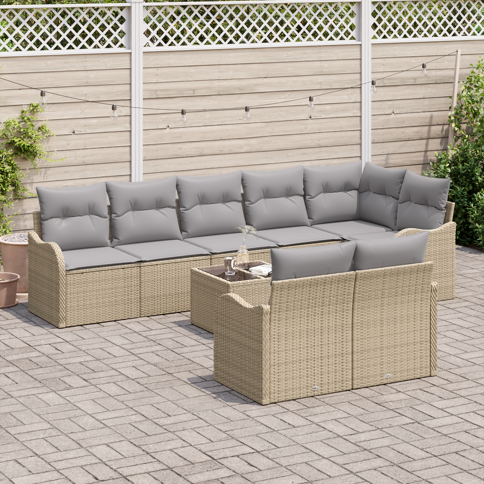 Setul de canapea modulară de 4 piese aduce un vibe modern și confortabil, perfect pentru a te bucura de aer liber. Combinația elegantă de ratan bej și perne gri va înfrumuseța orice terasă sau balcon.