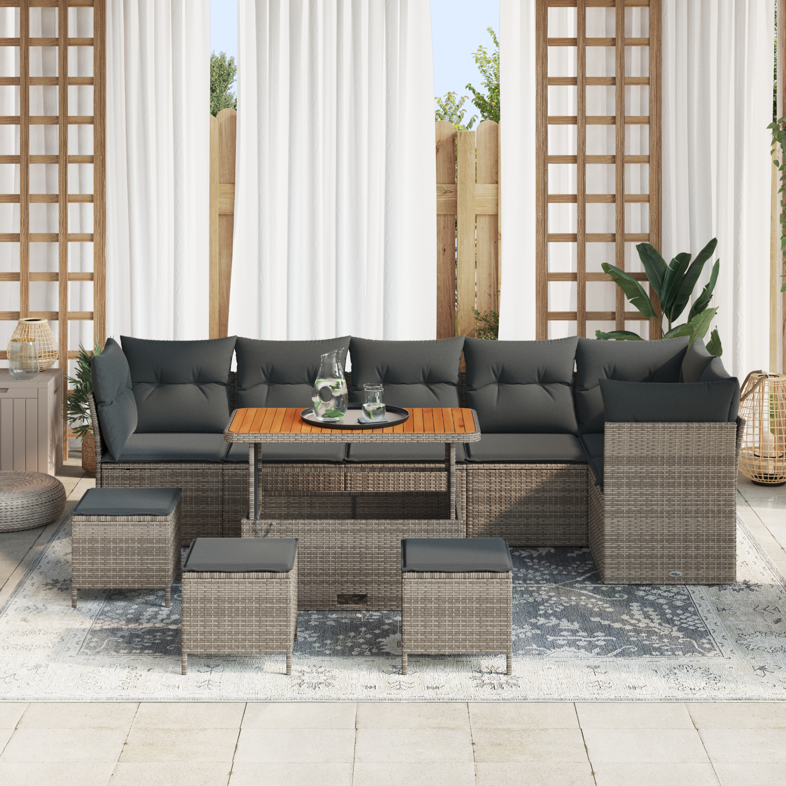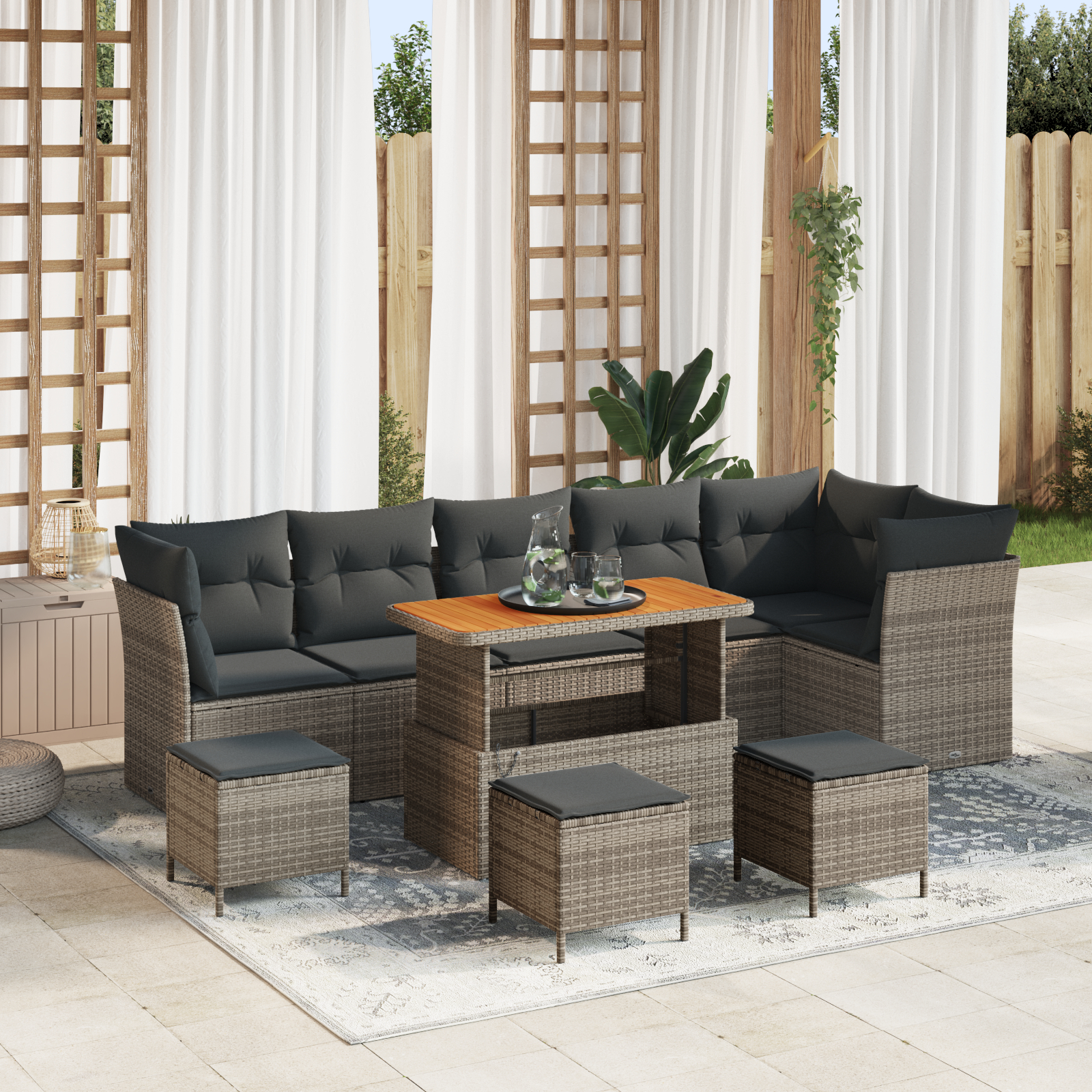 Set de Canapea de Grădină cu 10 Piese și Perne Gri Poliratan Acacia, Set de Dining de Grădină cu 4 Piese și Perne Gri Poliratan Acacia GartenMobel Dekor