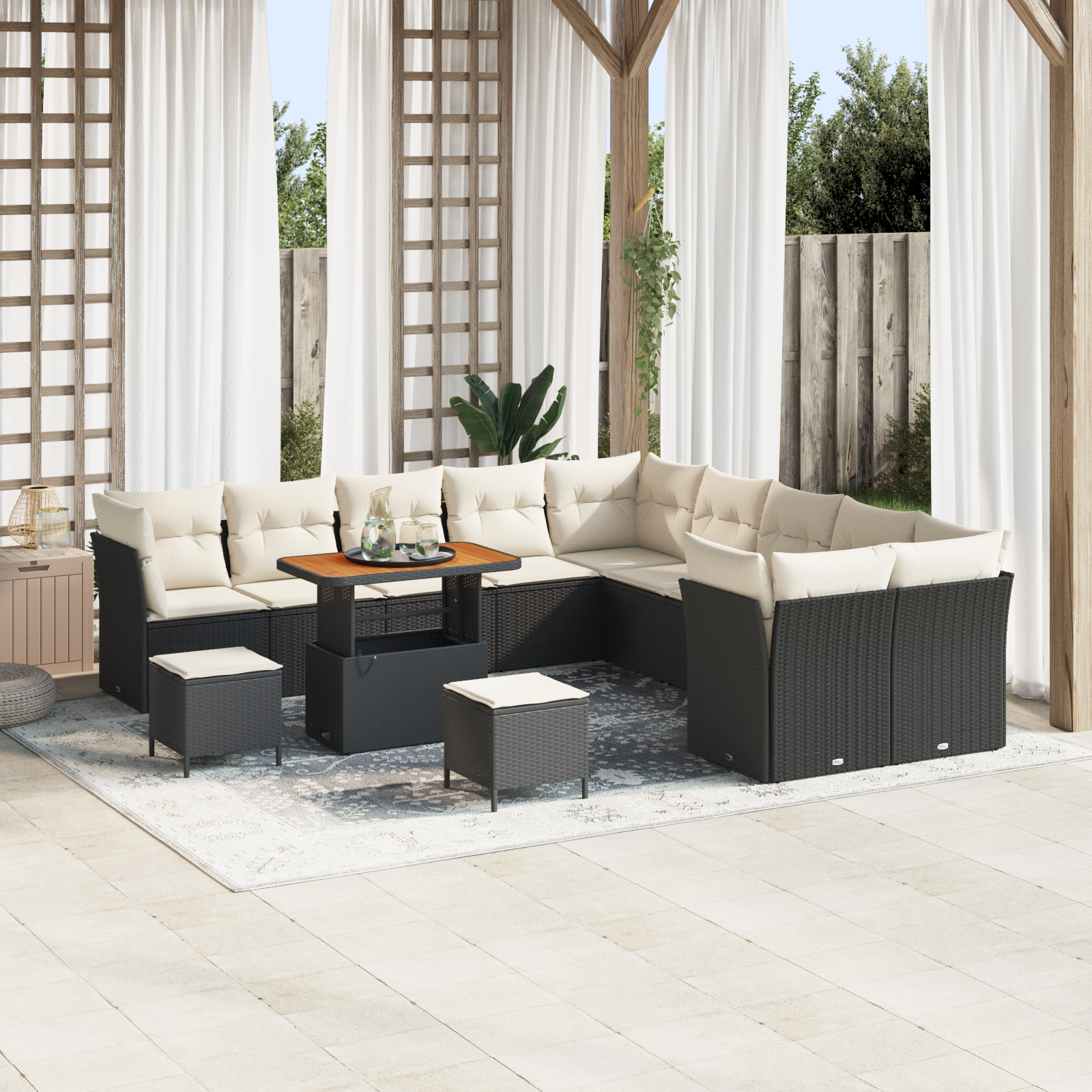 Set de canapea de grădină cu 13 piese și pernuțe, Negru, Ratan, Acacia, Set de dining de grădină cu 3 piese și pernuțe, Negru, Ratan, Acacia GartenMobel Dekor