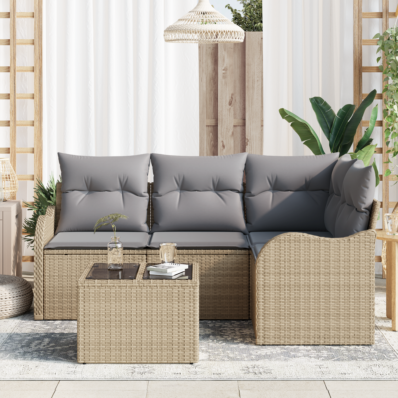 Canapeaua asta secțională e absolut fantastică pentru șezut stylish în grădină, perfectă pentru petrecut timp cu prietenii sau o seară liniștită. Împletitura modernă din ratan bej și gri îi dă un accent chic, iar pernuțele gri confortabile creează o atmosferă cozy, perfectă pentru relaxare în aer liber.