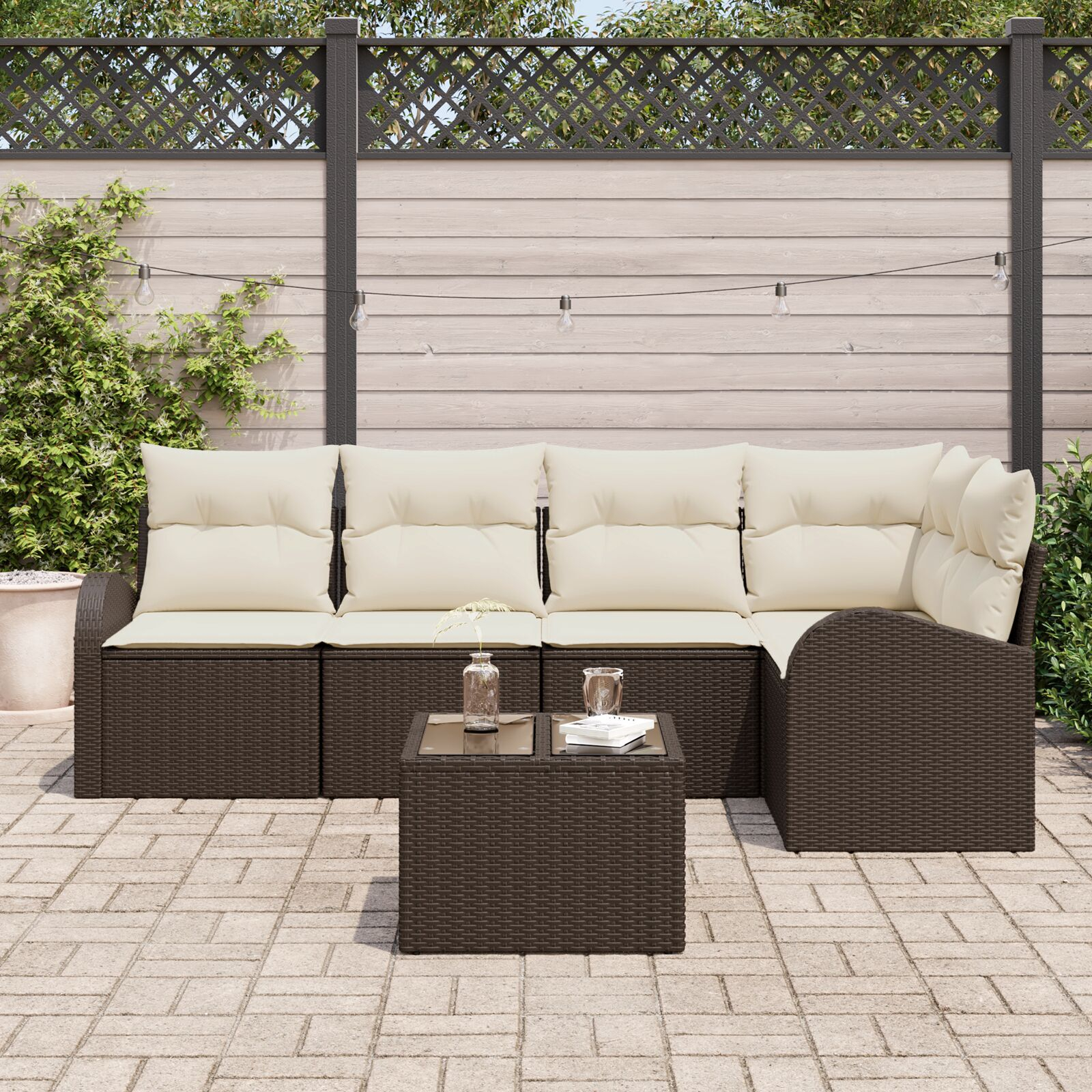 Setul ăsta de canapele de exterior e fain și util, făcut pentru grădini și terase cu confortul și stilul în minte. Ratanul poli maro se potrivește super bine cu pernele albe, creând o atmosferă modernă și cozy pentru întâlniri cu prietenii sau pentru relaxare la soare.