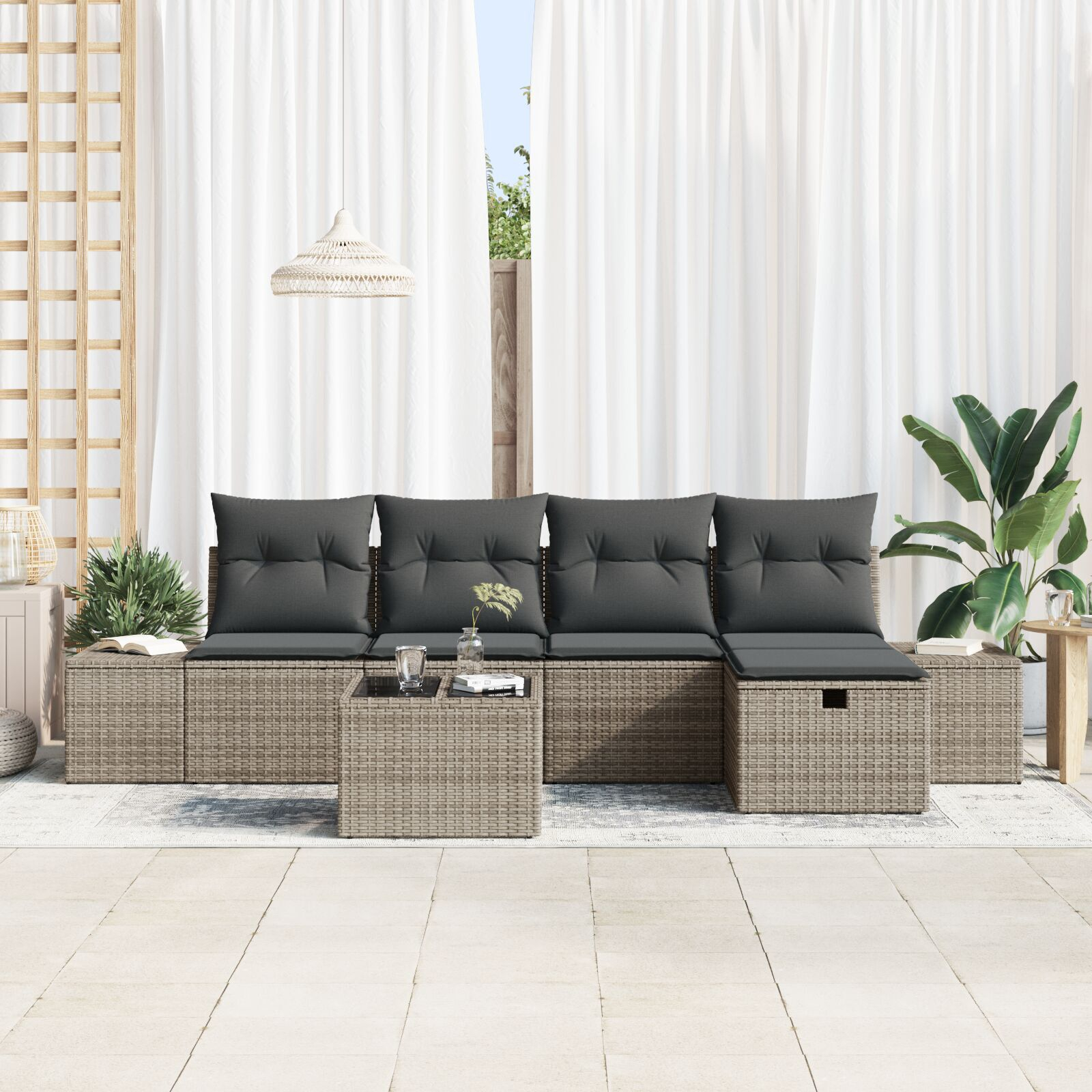 Îmbunătățește-ți zona exterioară cu acest set de canapea de grădină cu 6 piese, din ratan PE robust. E ideal pentru balconul ori terasa ta, oferind un loc stylish și confortabil să te relaxezi alături de prieteni și familie în aer liber.