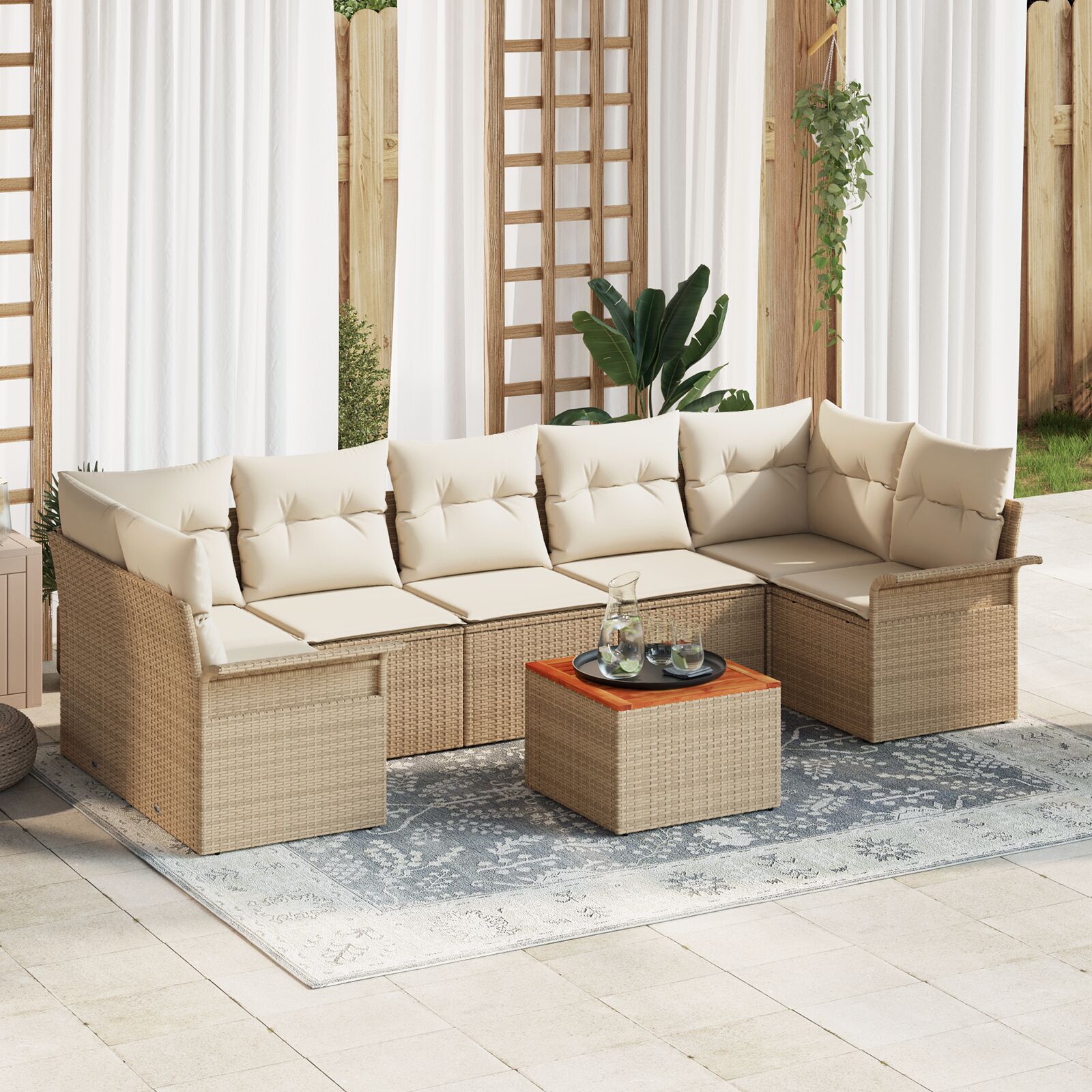 Setul de canapea de grădină cu 8 piese e perfect pentru petreceri în aer liber, având multe locuri pentru reuniunile de familie sau serile relaxante sub cerul înstelat. Amestecul de ratan bej și perne crem dă o vibrație modernă, ideală pentru terase, balcoane sau grădini, ca toată lumea să se relaxeze și să se bucure de confortul de a fi afară.