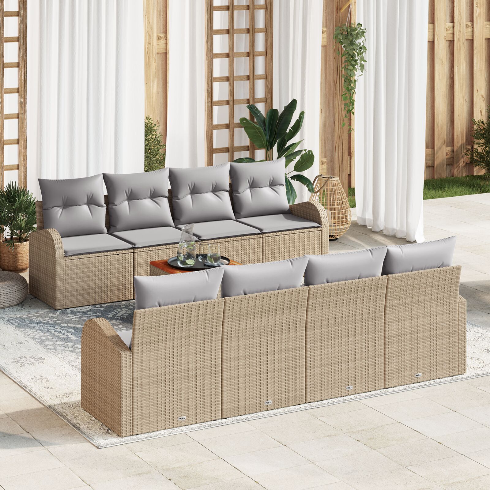 Setul ăsta de canapele de grădină aduce relaxarea afară la un alt nivel cu stilul lui modern, perfect pentru balcoane, terase și grădini. Combinația plăcută de bej și gri aduce eleganță, creând un loc confortabil pentru întâlniri sau seri relaxante.