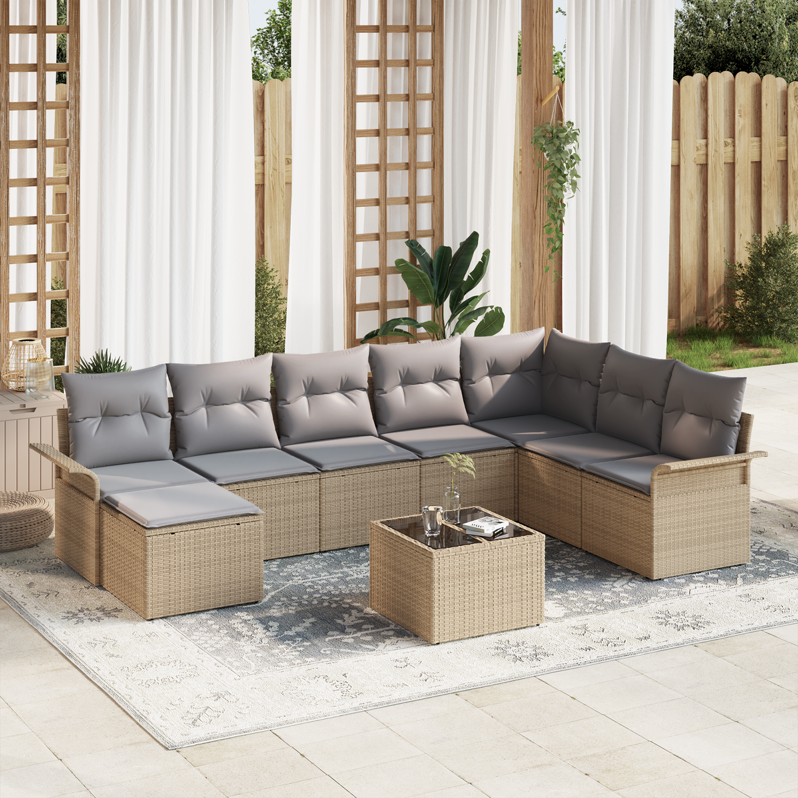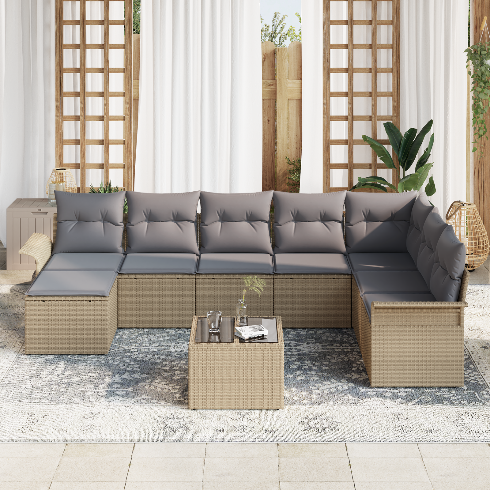 Acest set de canapea secțională pentru afară îmbină stilul modern cu utilitatea, fiind o alegere faină pentru zona ta exterioară. Combinația de bej și gri, pe lângă textura de ratan țesut, arată super cool și se potrivește perfect pentru terasă, grădină sau balcon.