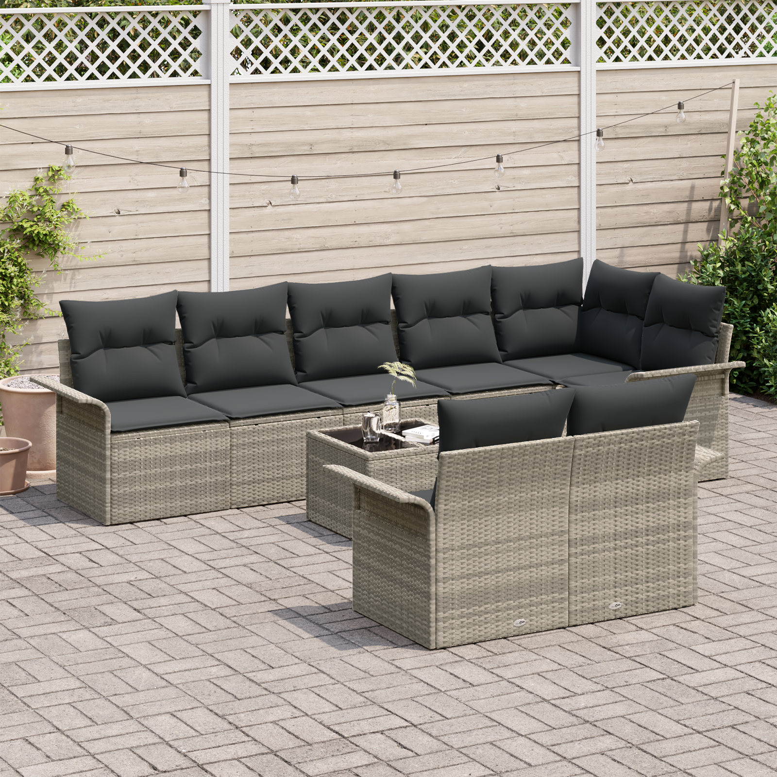 Acest set de canapea de grădină e o combinație faină de stil și utilitate care îți va transforma spațiul exterior. Designul său modular trendy e confortabil și flexibil, perfect pentru a avea prietenii în jur sau pentru a te bucura de o seară relaxantă sub cerul înstelat.