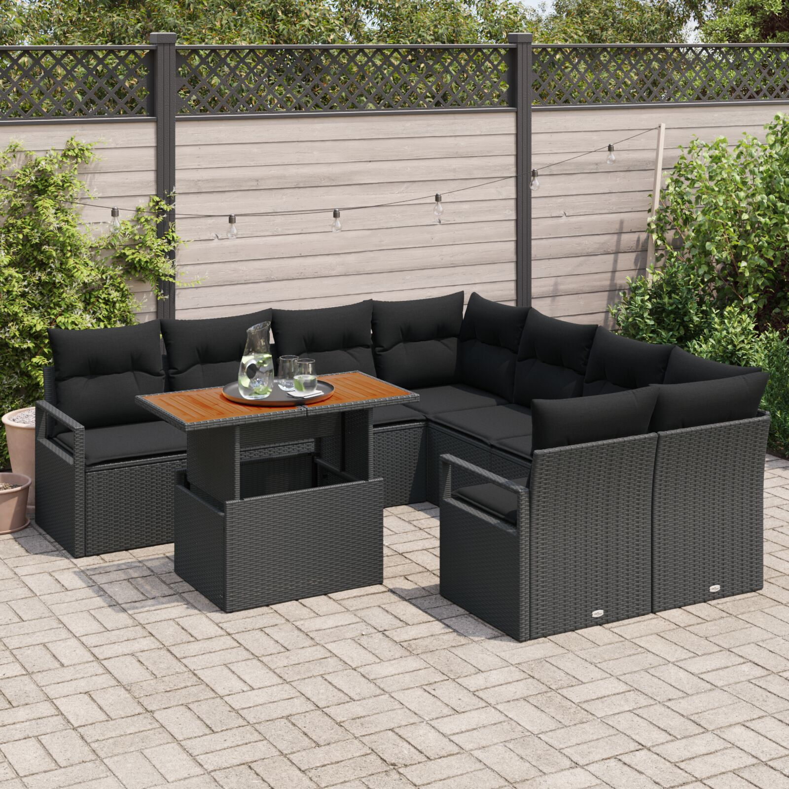 Setul ăsta de canapele de grădină cu 9 piese din poliratan negru e combinația perfectă de confort și stil, făcut să îți aducă relaxarea afară la un alt nivel. Cu designul modular, poți să-l aranjezi cum vrei ca să se potrivească spațiu și atmosfera ta, fiind genial pentru întâlniri sau serile liniștite pe balcon sau în conservator.