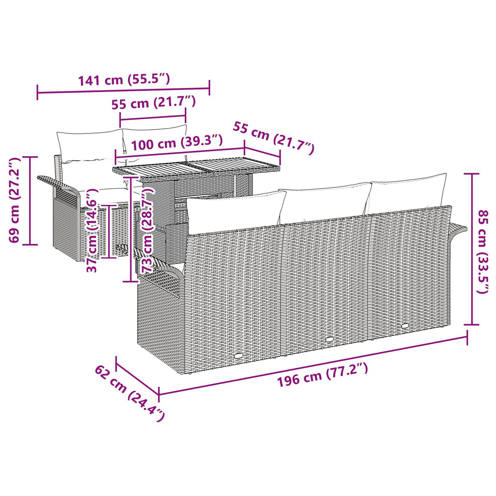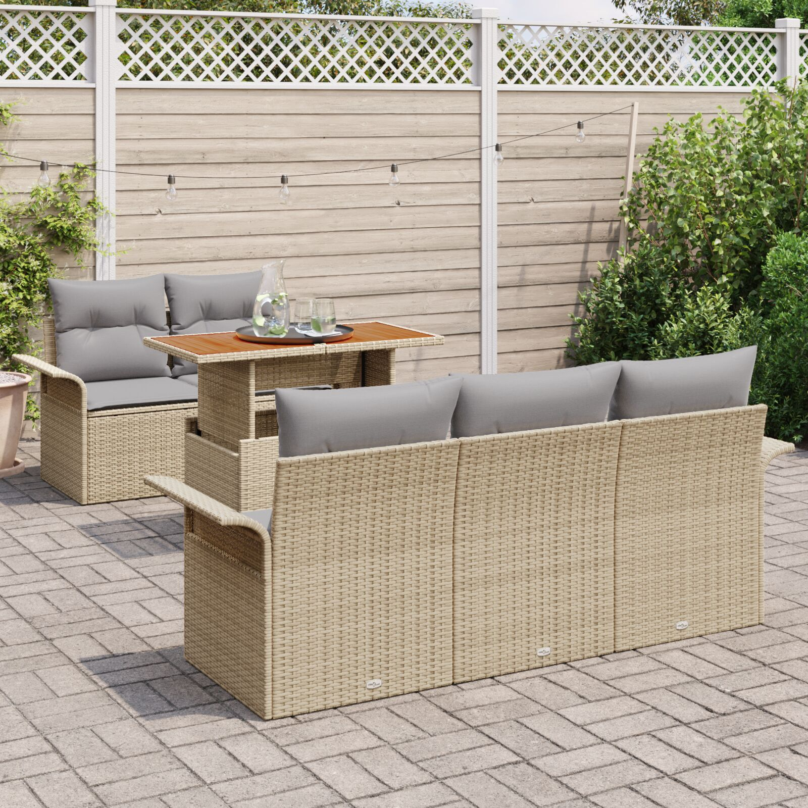 - Livrarea conține: 4 x Canapea cu braț inclusă cu funcția de depozitare, 1 x Sezlong central inclus cu funcția de depozitare, 1 x Masă de grădină
