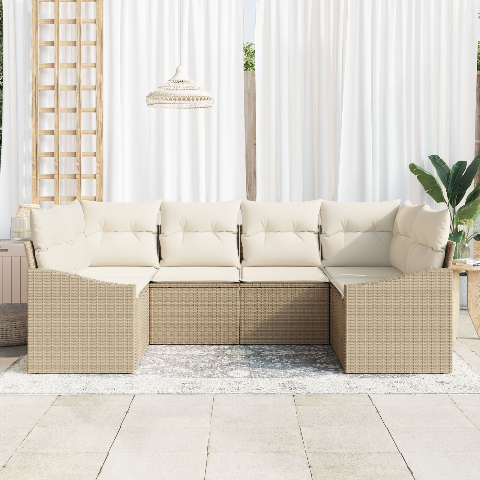 Canapea asta modulară de exterior aduce o vibrație modernă și flexibilitate cu multă căldură, pentru până la șase persoane. E făcută din ratan poli bej robust și are perne crem comfortabile. Transforma zonele tale exterioare și interioare însorite în locuri perfecte pentru relaxare și distracție.