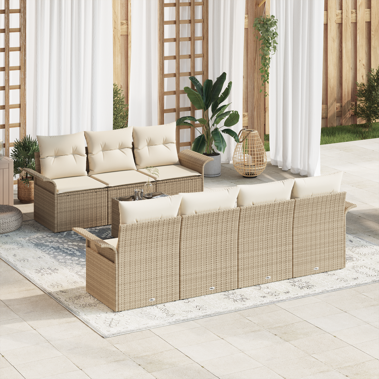 Acest set de canapea de grădină îți oferă o actualizare modernă pentru spațiul exterior, având multe locuri. Făcut din ratan poli și perne confortabile de bej și crem, e perfect pentru relaxare și timp petrecut cu prietenii sau familia.