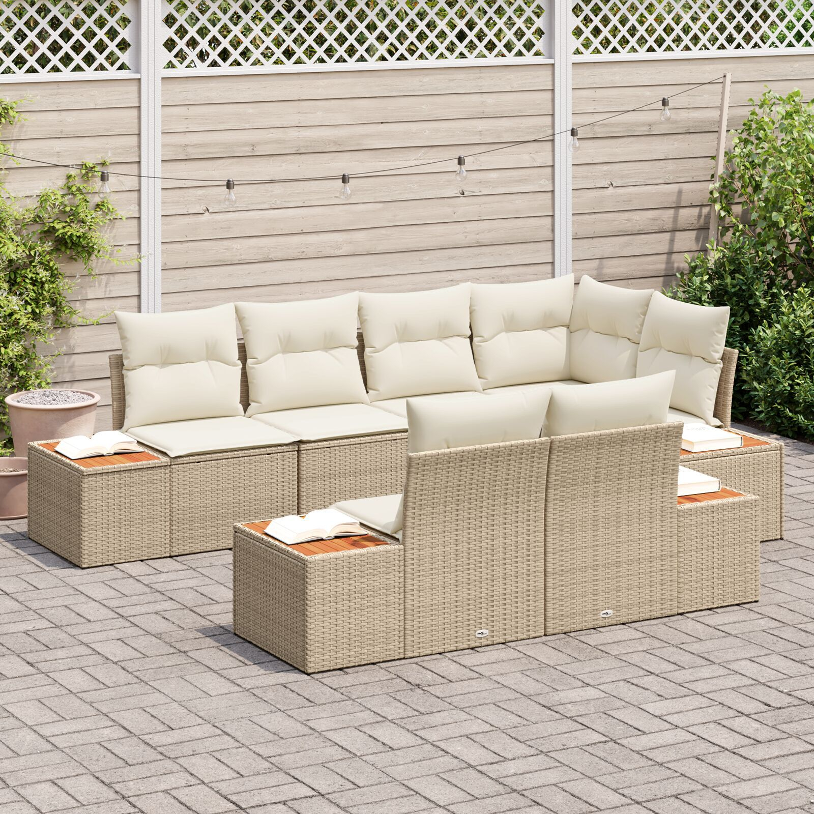 Setul ăsta de canapea colțară bej și crem e exact ce-ți trebuie pentru a te relaxa afară, având suficient loc pentru toți prietenii și familia. Cu un design elegant și culori frumoase, crează o atmosferă caldă pe balconul sau patio-ul tău.