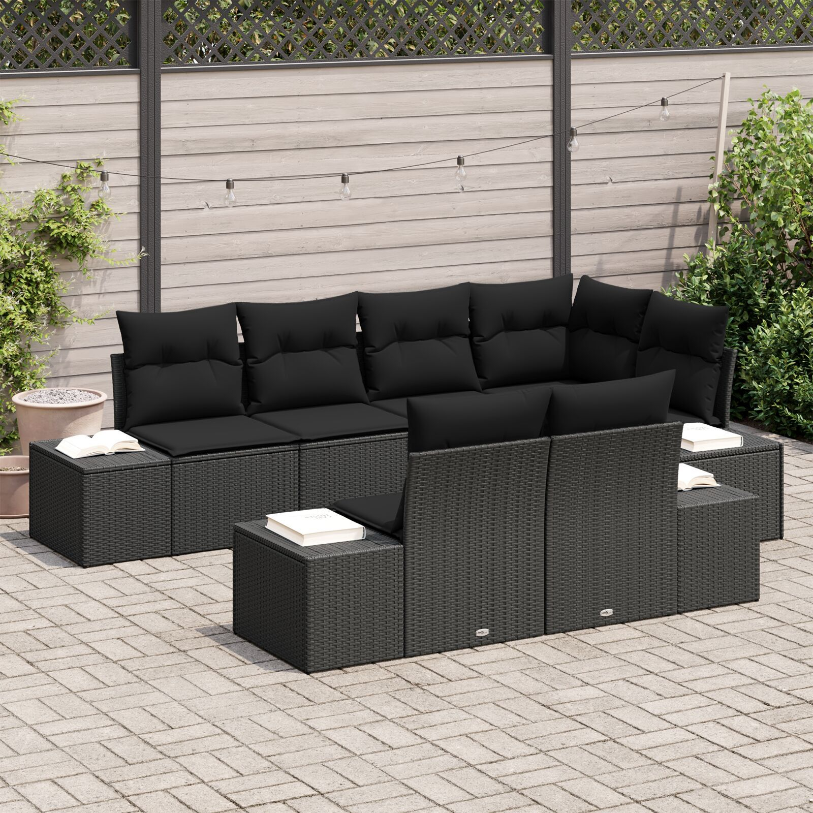 Setul de canapele secționale pentru exterior arată modern și cool, îmbinând stilul cu confortul pentru relaxarea afară. Ideal pentru terase, balcoane sau grădini, cadrul elegant din poliratan negru merge de minune cu pernele albe pufoase, creând atmosfera perfectă pentru întâlniri sociale sau doar pentru a te relaxa.