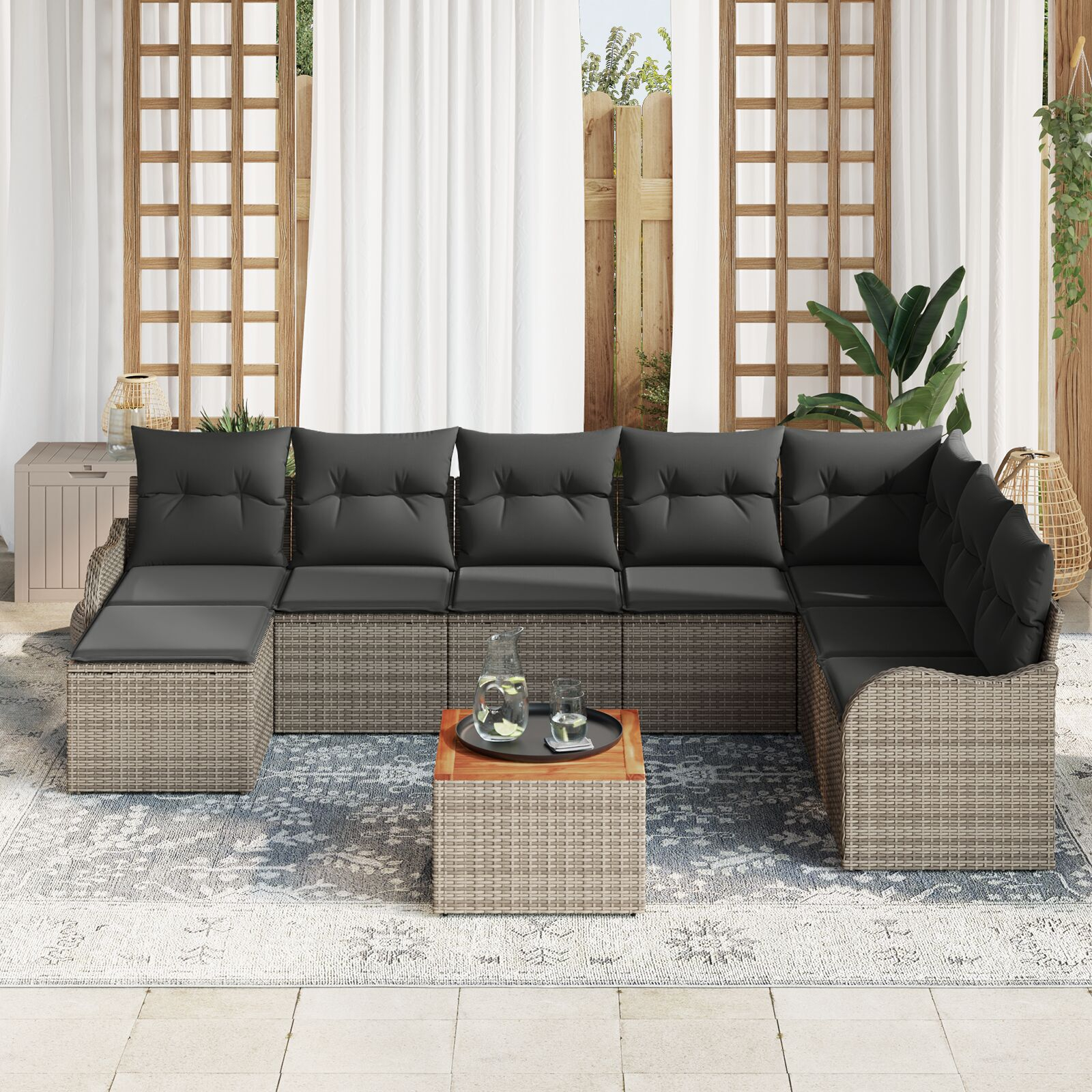 Acest set de canapea pentru grădină e o alegere elegantă și practică pentru relaxat în aer liber, perfect pentru balcoane și verande. Designul modular permite combinarea pieselor cum vrei, fiind ideal pentru a distra oaspeți sau pur și simplu pentru a te relaxa într-o zi frumoasă în grădină.