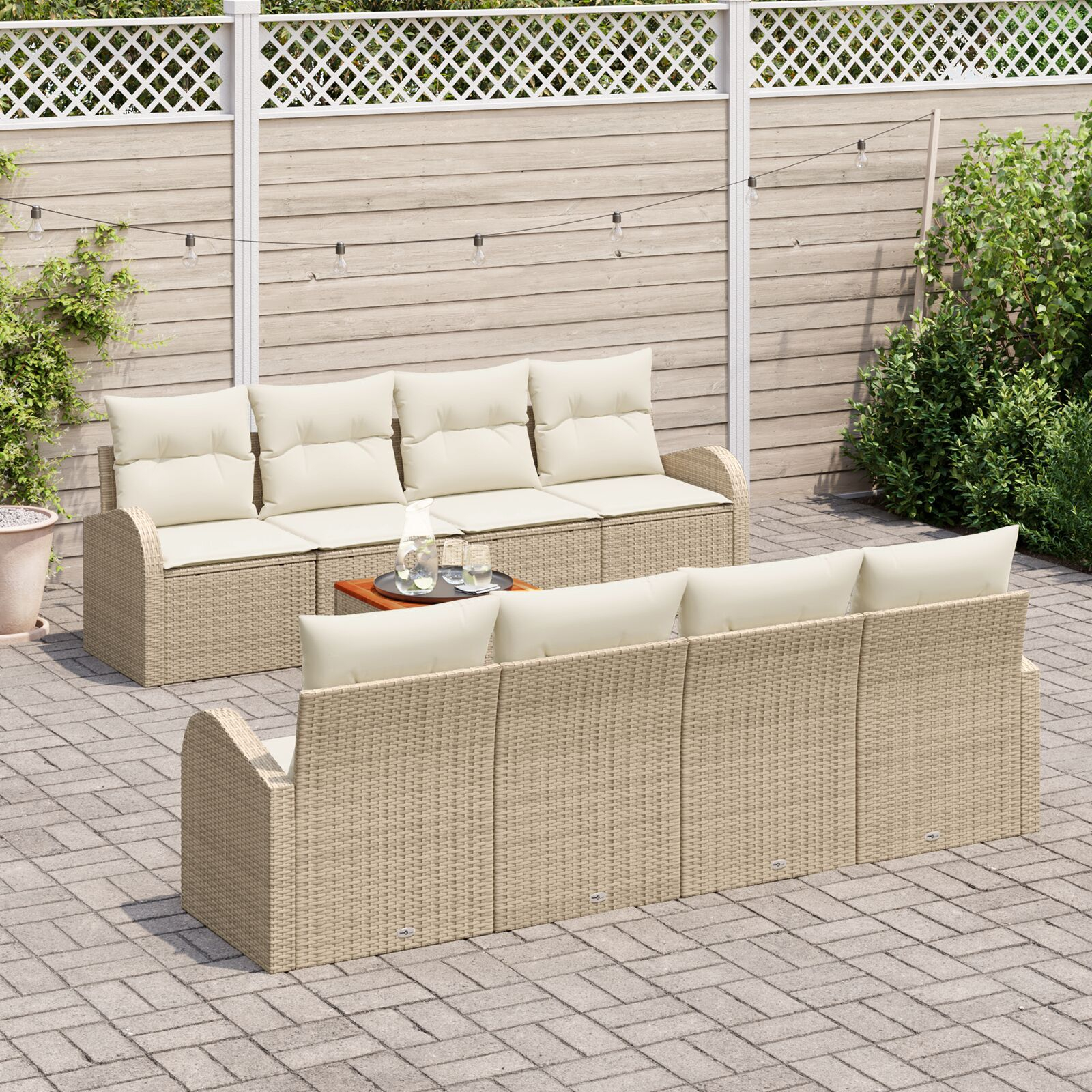 Setul ăsta de canapele de grădină duce relaxarea afară la un alt nivel. Cu designul său modern, e perfect pentru balcoane, patio sau grădini. Combinând culorile bej și crem, aduce eleganță, creând un loc confortabil pentru întâlniri sau zile leneșe la soare.