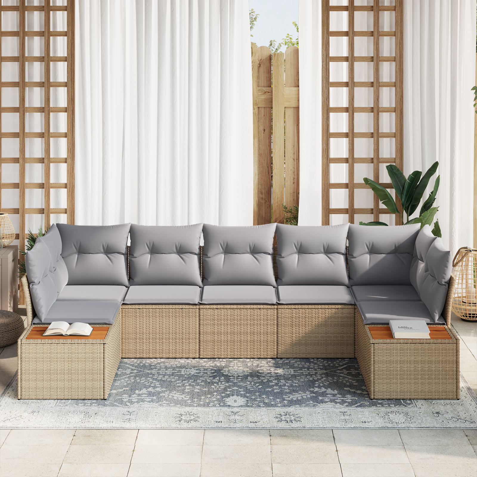 Setul ăsta de canapea pentru grădină e totul despre stil și utilitate, gândit să aducă un vibe fain în zona ta exterioară. Cu un design super în bej și gri deschis, piesele modulare se pot combina cum vrei, perfect pentru balcoane sau terase.