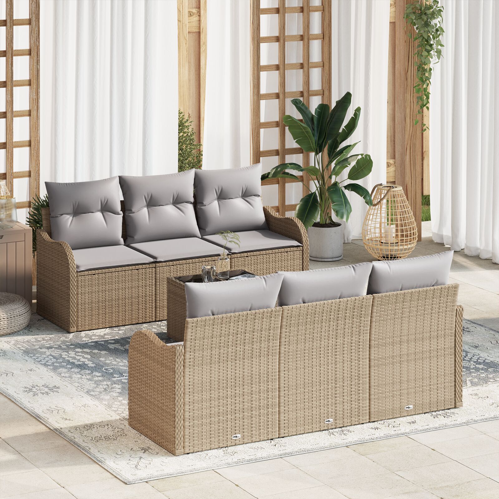 Setul ăsta de canapea de grădină cu 7 piese are un vibe modern, perfect pentru relaxare și întâlniri cu prietenii. E super pentru balcoane sau grădini, iar construcția elegantă din ratan polimer bej și gri deschis îi dă un aspect deosebit, aducând stil întâlnirilor tale afară.