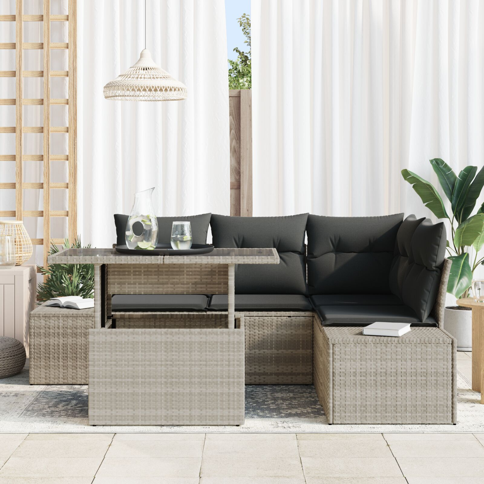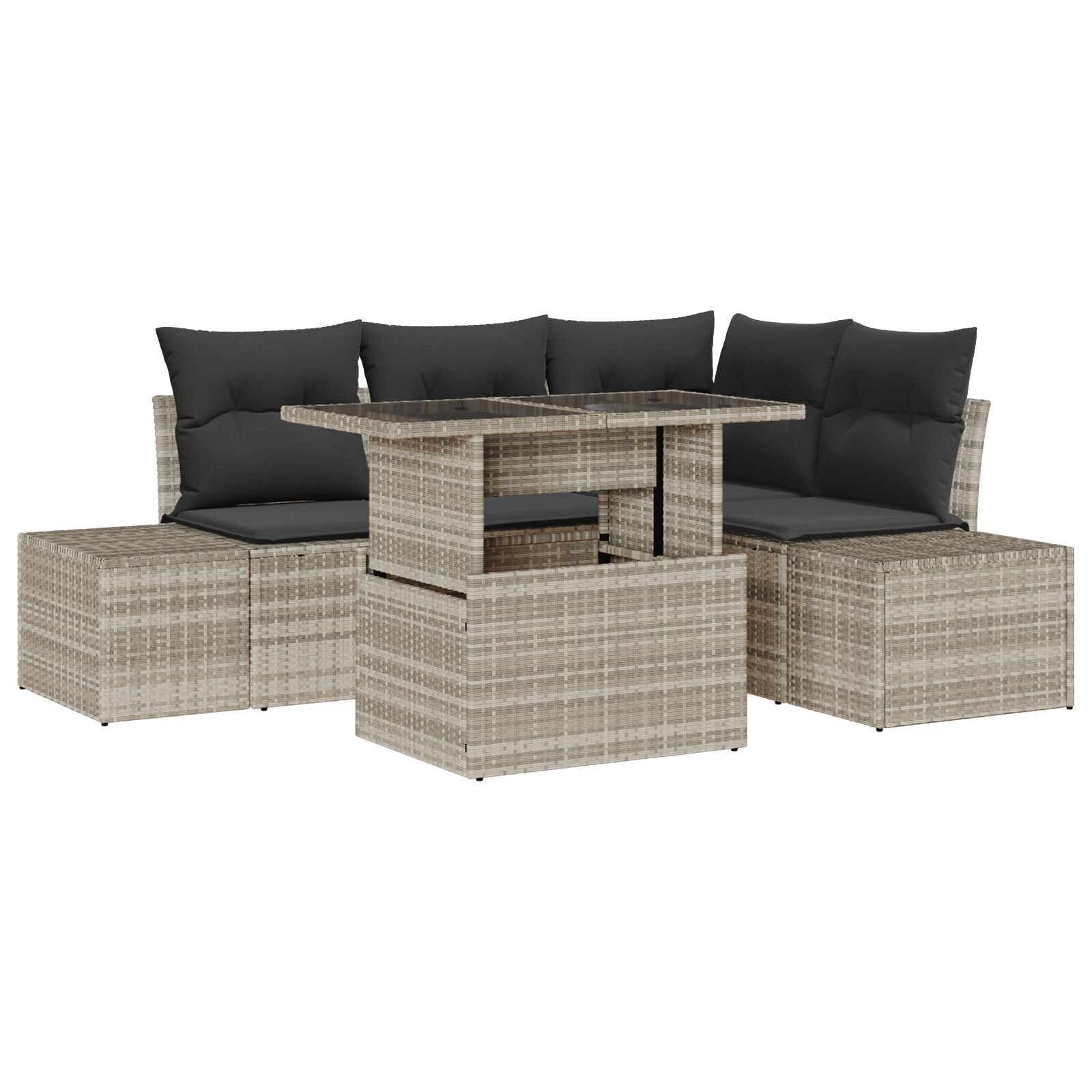 Setul ăsta de canapele de grădină cu 5 piese e o alegere super bună și practică pentru spațiile exterioare. Are un stil modern și caracteristici utile. Ideal pentru întâlniri cu familia sau relaxare cu prietenii, transformă-ți balconul, patio-ul sau grădina într-un loc confortabil și stylish, cu designul său elegant din ratan gri și pernele moale.