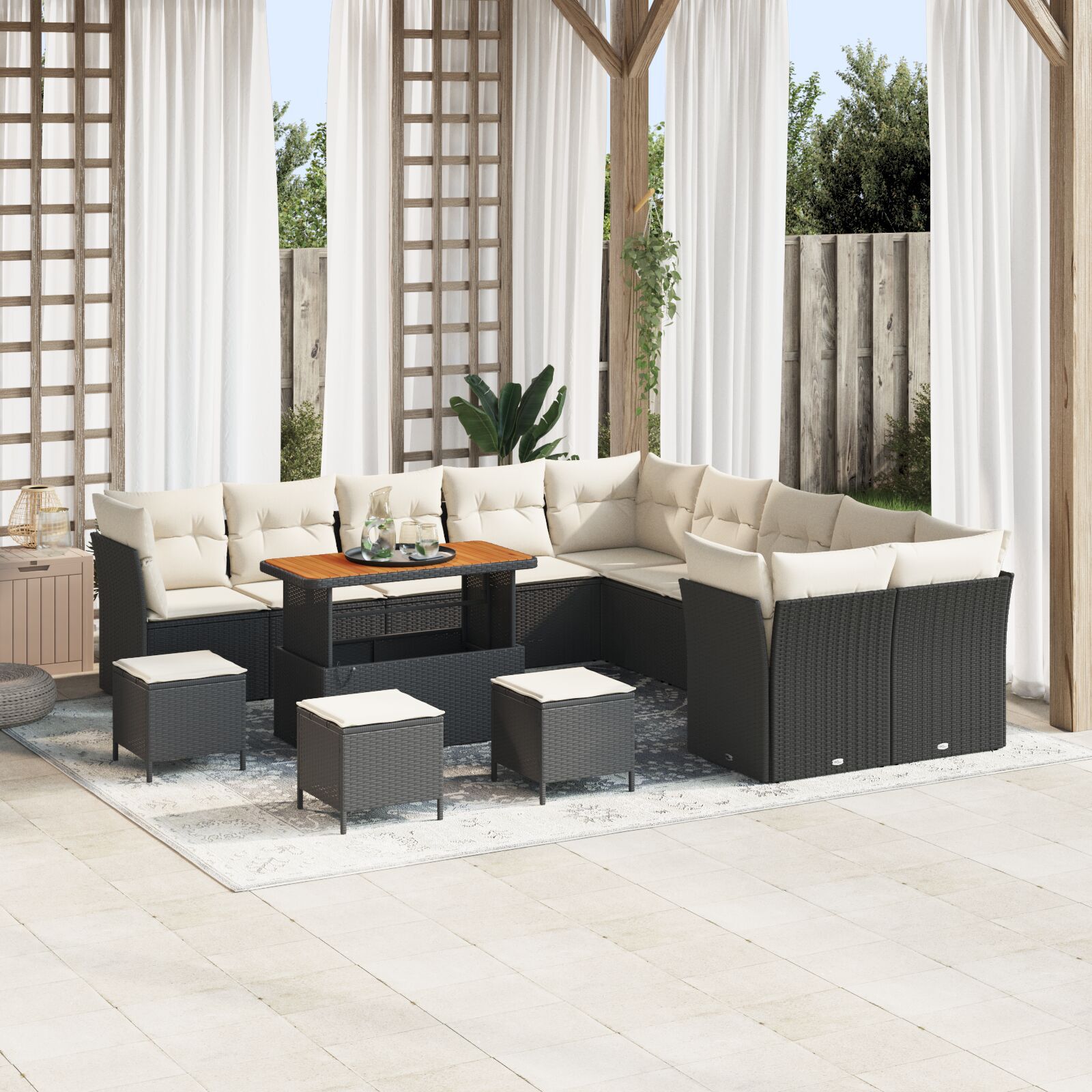 Setul ăsta de canapea pentru grădină combină un look modern cu confort maxim, făcându-l alegerea perfectă pentru petrecerile afară. Rattanul negru classy combinat cu pernele crema creează o atmosferă stylish pentru patio, balcon sau grădină.