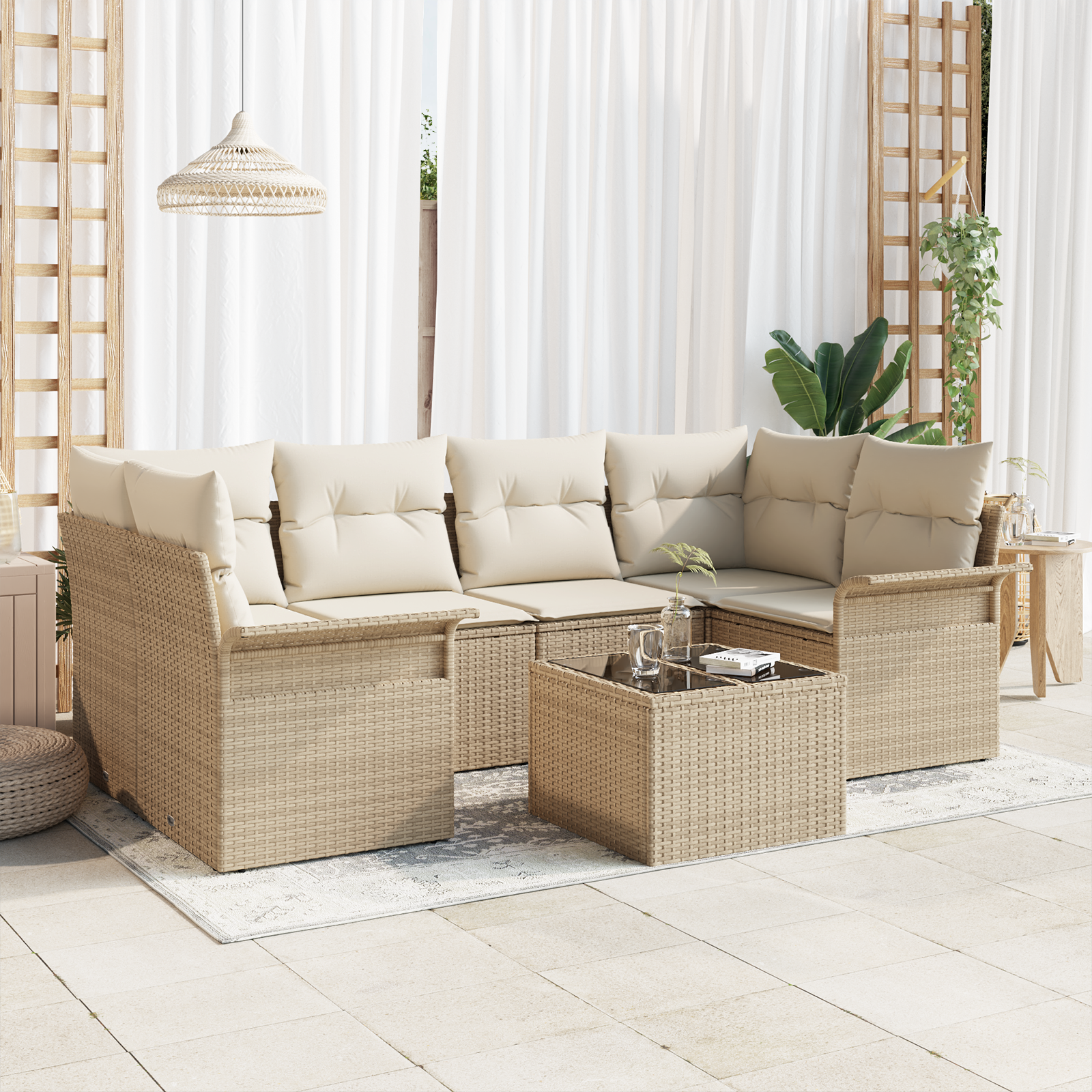 Set de Canapea pentru Grădină cu 7 Piese cu Pernițe Bej din Ratan Poli, Canapea Grădină cu Două Locuri cu Spațiu de Stocare & Pernițe Bej din Ratan Poli GartenMobel Dekor