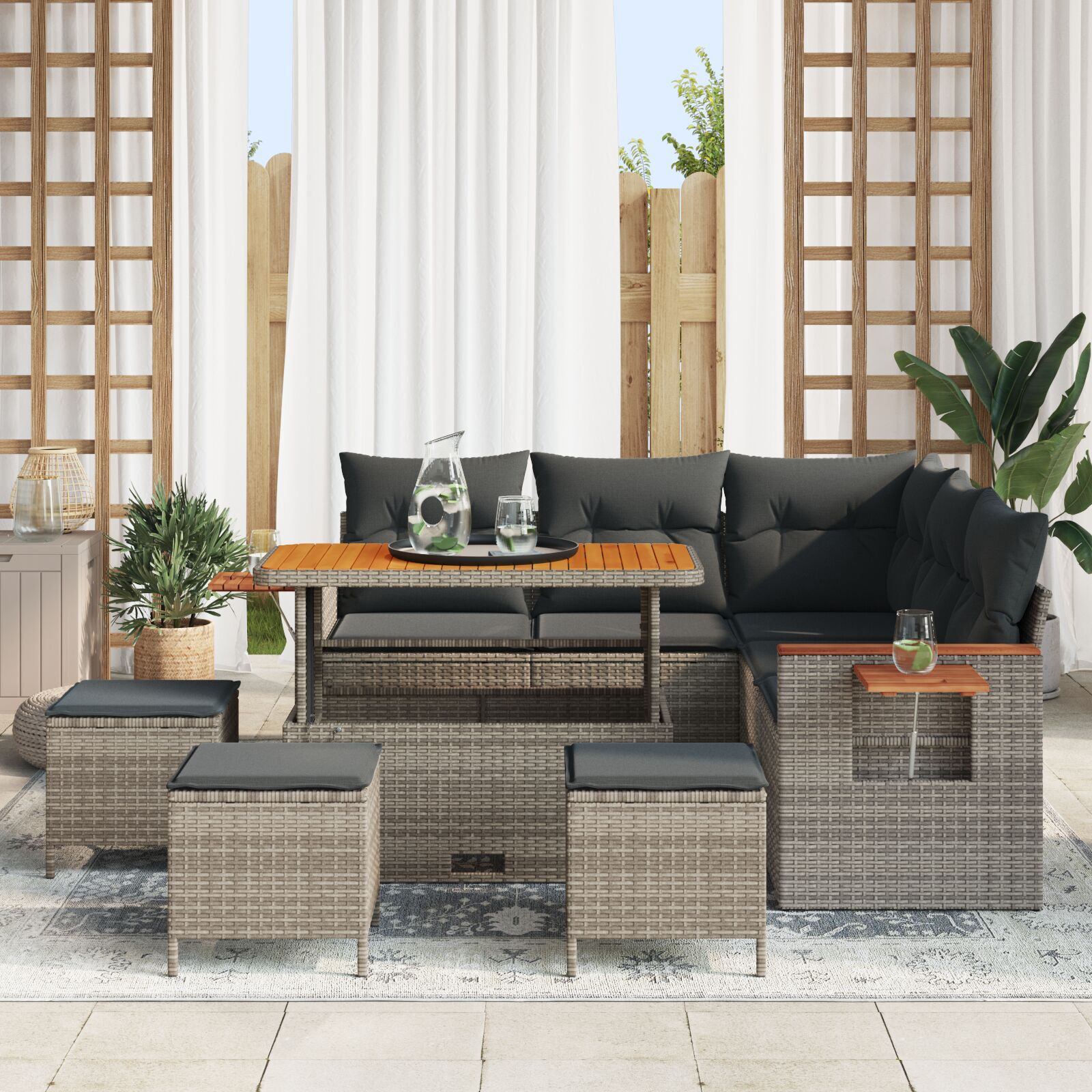 - Cu un design elegant ce include perne gri închis și o masă frumoasă din lemn, setul îmbunătățește orice terasă sau balcon, integrându-se fără probleme în diverse stiluri.