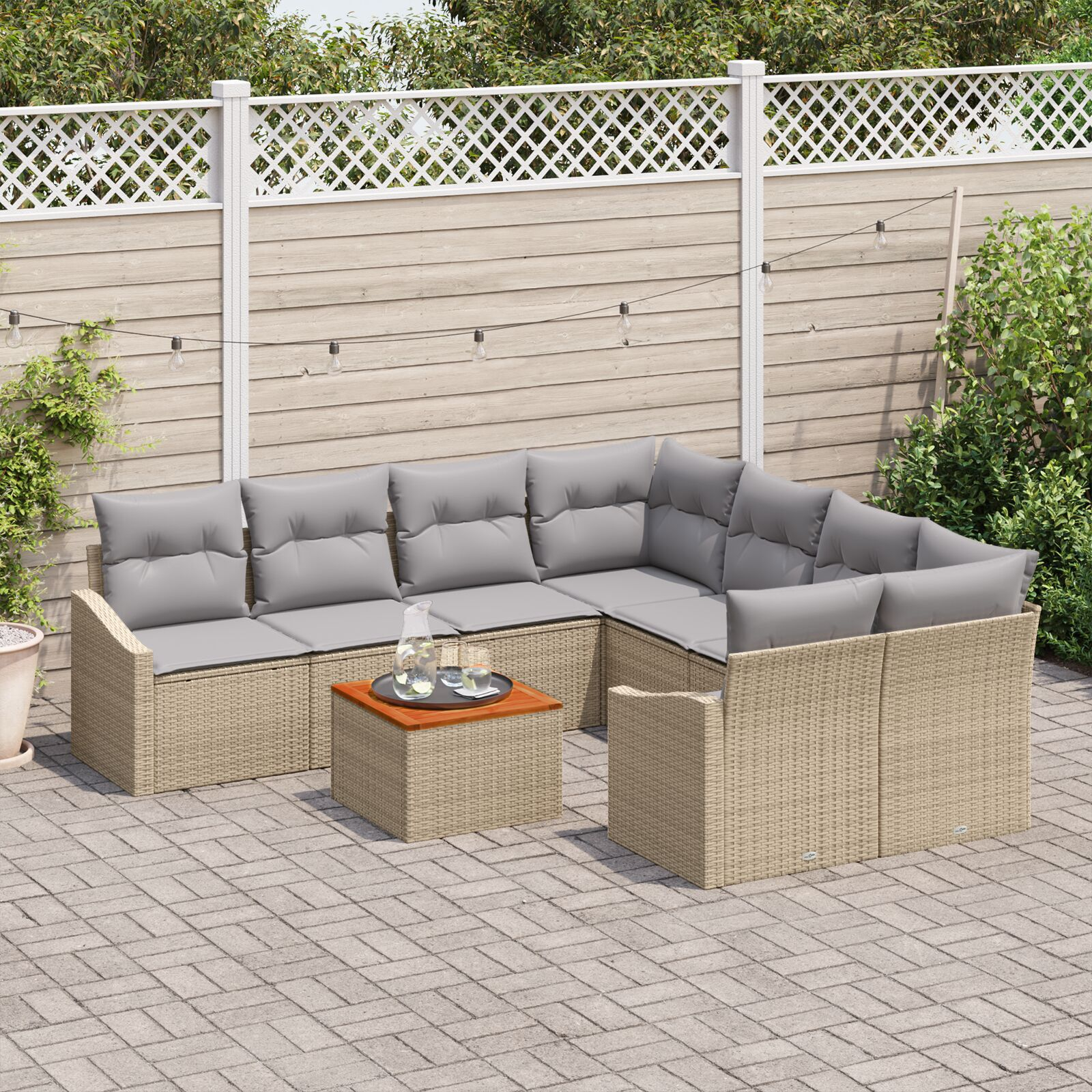 Acest set de canapea pentru grădină cu 9 piese e o alegere super pentru relaxare afară. Designul modern, cu nuanțe bej și gri, îl face să arate bine pe patio, balcon sau grădină - perfect pentru întâlniri cu prietenii sau pentru a te bucura de o după-amiază leneșă.
