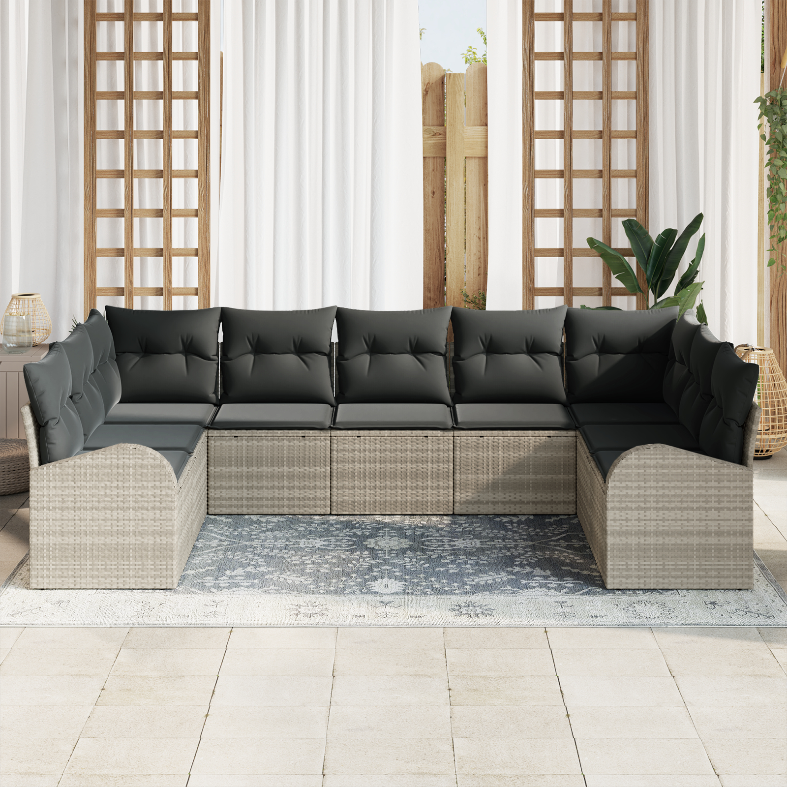 Setul de canapea secțională pentru exterior e o combinație excelentă de design modern și confort, perfect pentru relaxare afară sau pentru a găzdui prieteni cu stil. Scheletul din poliratan gri deschis, împreună cu pernele moi cărbune, oferă un aspect plăcut care va face patio-ul, grădina sau balconul tău să arate bine, având locuri suficiente pentru întâlniri sau seri cozy sub stele.