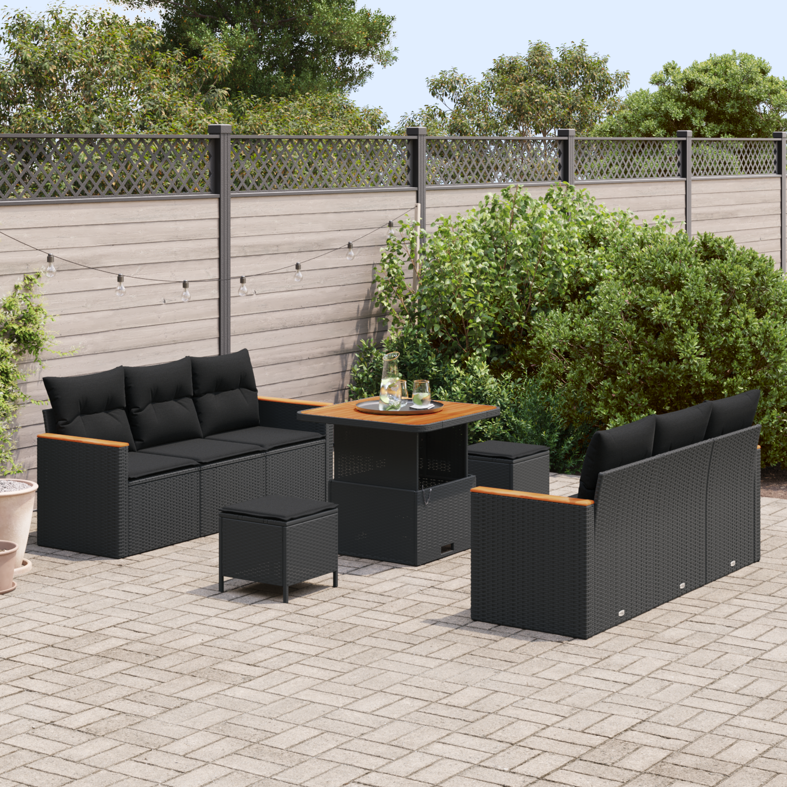Set de canapea pentru grădină cu 9 piese și perne Negru Poliratan Acacia, Set de dining pentru grădină cu 3 piese și perne Negru Poliratan Acacia GartenMobel Dekor