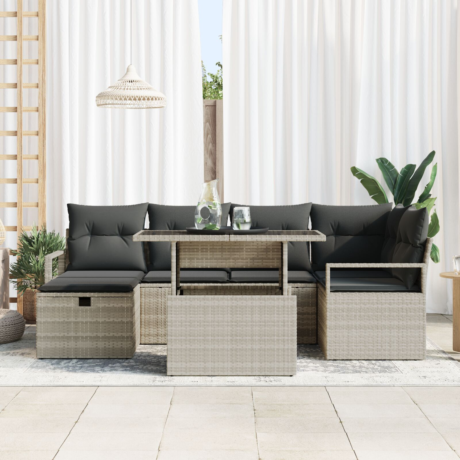 Acest set de canapea pentru grădină în 7 piese, gri deschis, e atât funcțional cât și elegant, fiind o alegere de top pentru relaxare afară. Cu un design super și un vibe minimalist elegant, se potrivește perfect în terase, balcoane sau grădini, creând un loc confortabil pentru întâlniri și clipe liniștite.