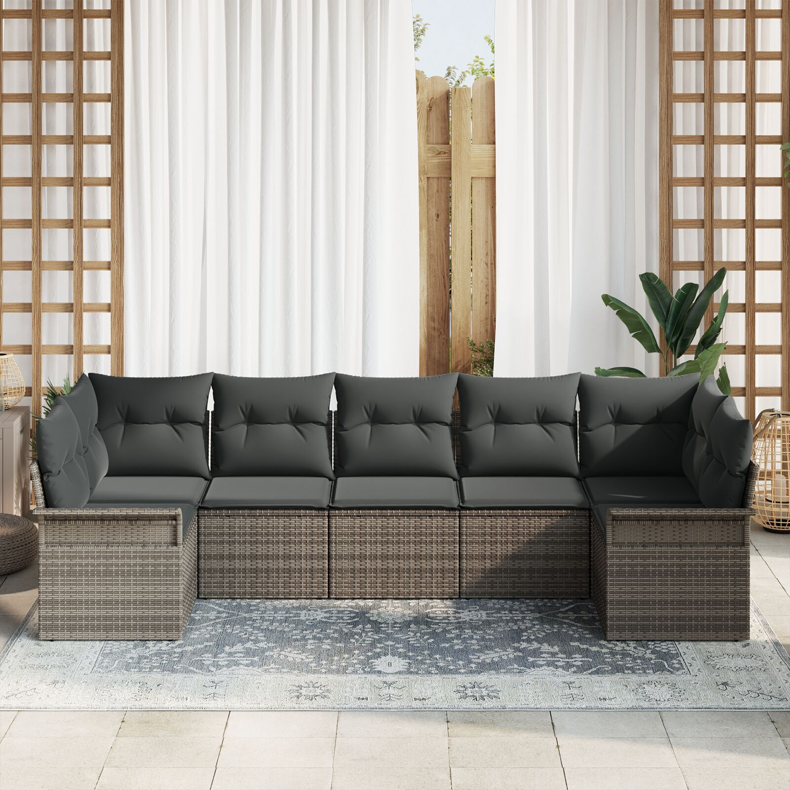 - Design modular: Această canapea secțională poate fi rearranjată pentru a se potrivi în diverse locuri exterioare, oferindu-ți flexibilitate în privința șederii. Poți să o aranjezi cum dorești pe terasa ta.