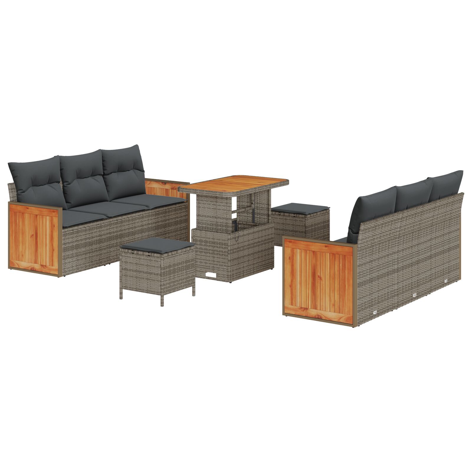 - Aesthetică Elegantă: Mixul superb de ratan poliratán gri și lemn de acacia natural adaugă un strop de sofisticare zonei tale exterioare. Setul ăsta de canapea nu e doar practic, ci adaugă și un aspect plăcut spațiului tău.