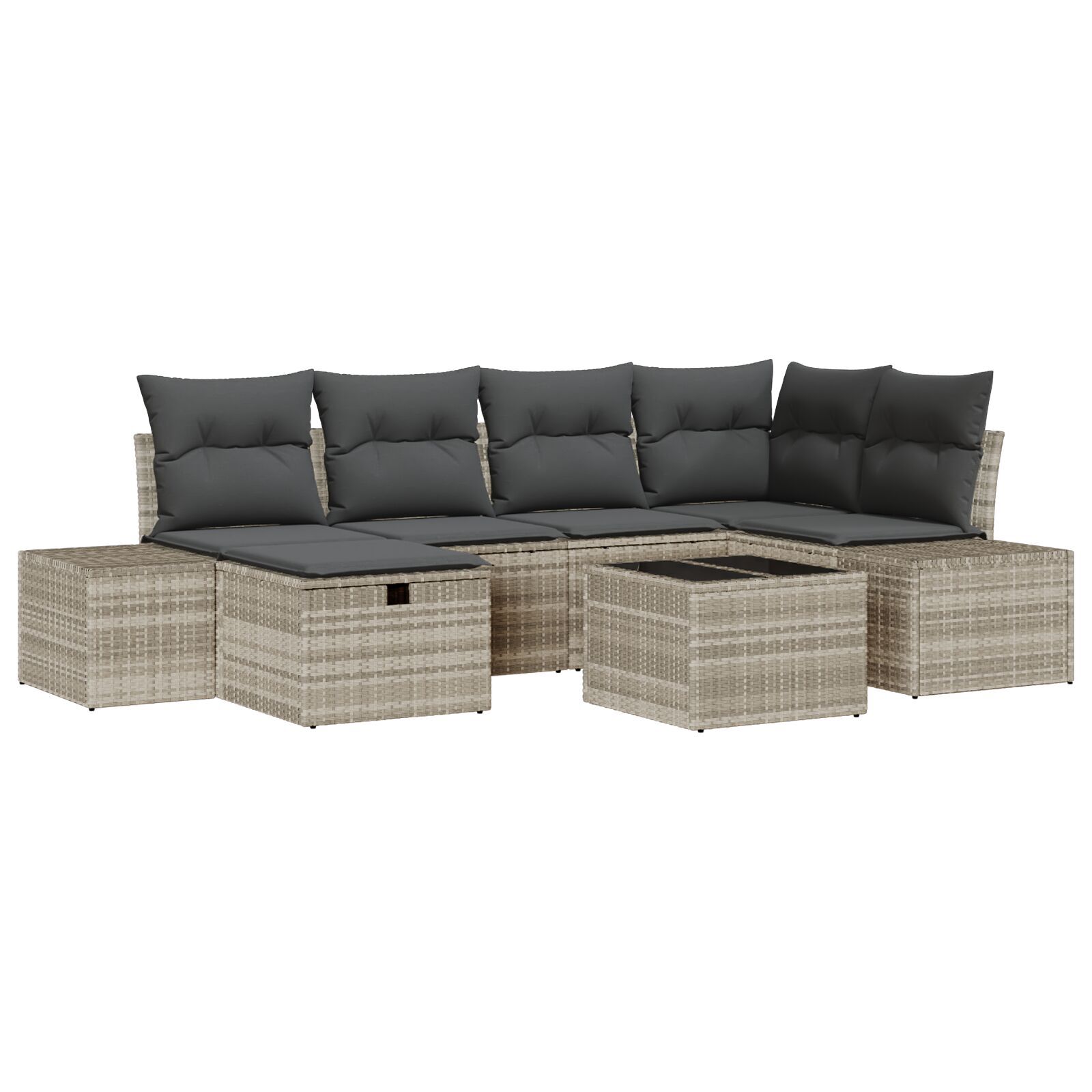 Setul de canapea secțională pentru exterior aduce un vibe modern care transformă orice grădină sau balcon într-un loc de relaxare. Cu perne confortabile și depozitare ascunsă, e perfect pentru întâlniri sau zile leneșe cu o carte bună.