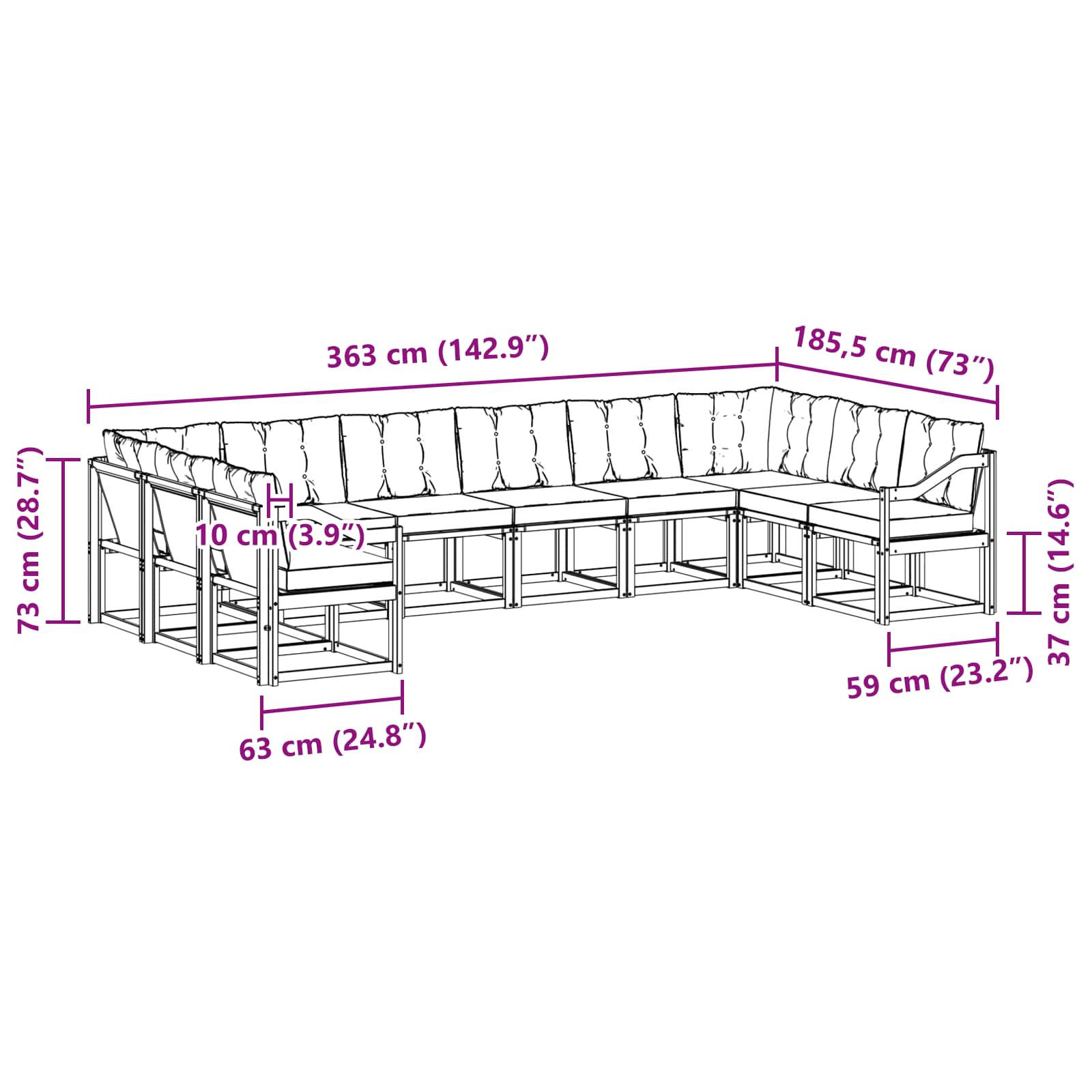 - 8 x Canapea de mijloc: 59 x 63 x 73 cm (LxWxH)